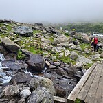 Der Aufstieg zur Greizer Hütte zieht sich im unteren Teil über den brockenübersäten Talschluß, der mit seiner Länge an Steilheit zunimmt. Vor der Steilstufe zur Greizer Hütte zweigt der Steig über die Mörchenscharte zur Berliner Hütte inmitten der Bachläufe ab. Im Getöse der Bäche folgten wir wortlos unserem Ziel auf die linke Talflanke zustrebend. Die Fachwerkbrücke über den Floitenbach wies den Weg in den Nebel auf nach Westen auf die Mörchenscharte.