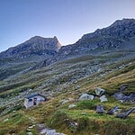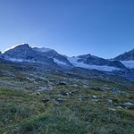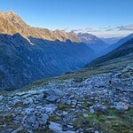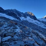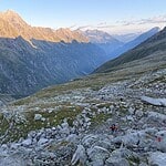 Der Steig führt zunächst über das sogenannte Griesfeld, dessen Name auf die großformatigen gneisiger Felsplatten zurückzuführen sein mag, über die sich die Routenführung hinan zieht. Mit moderater Steigung durchquerten wir diesen Abschnitt und erfreuten uns am frühmorgendlichen schattigen Panorama, geziert an den Graten von leuchtenden Gipfeln.