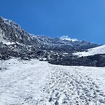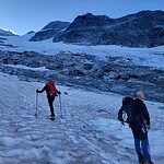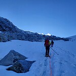 Die ersten Firnschuppen konnten wir trotz hart gefrorener Oberfläche noch ohne Steigeisen begehen und das war auch die richtige Entscheidung, um über die glatt geschliffenen Klippen darüber hinweg zu kommen.