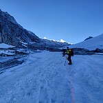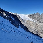 Rechts querab der imposant aufsteigenden Nordrippe die vom Großen Löffler herabzieht befand sich der Eisrand mit Blankeis und erzwang Steigeisen. Wir seilten uns an, da uns die Beschaffenheit des Gletschers nicht bekannt war.