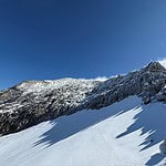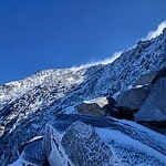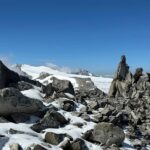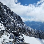 Nach dem verstauen des Seil in einem Depot am Felsrand machten wir uns mit Steigeisen auf den Grat und knirschten über die Felsblöcke. Leider ließen wir uns von den Blöcken auf die Nordseite leiten und stellten nach wenigen Minuten fest, daß die Flanke uns wieder hinunter drängen will und kein einfacher Durchstieg durch eine Verschneidung vor uns lag, die direkt zum Schrund leitete und nach oben hin zu glatt zum Durchsteigen war. Also entschieden wir den Rückzug, um den Normalaufstieg in Augenschein nehmen.