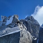 Die Kameraden machten allerdings am Grat angekommen klar, daß sie keinen zweiten Versuch unternehmen wollten. Also machte sich der Verfasser auf und fand tatsächlich auf der Südseite eine Umgehung der Verschneidung, die uns zuvor abdrängte. Warum uns diese Möglichkeit nicht gleich in den Sinn gekommen sein mag – sinnierte der Verfasser am weiteren Weg am Grat – mag möglicherweise mit der Kälte zusammenhängen, der wir entkommen wollten. Daher wahrscheinlich der ungeduldige Rückzug und zu wenig Ausloten der Möglichkeiten. Ein nicht unbekanntes Fehlverhalten beim Klettern.