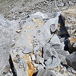 In einer Zone granitischer Brocken, die ein völlig anderes Bruchverhalten zeigen und den Übergang in den sogenannten Zillertaler Kern markieren, erklimmt der Steig die erste deutlich erhobene Moränenkrone auf etwa 2.500 m und ein kleiner Gletschersee wird sichtbar. Ein großer Steinmann markiert die Route. Etwa 100 m höher geht das Brockenfeld in felsiges Gelände über, das von schönen Schliffformen geprägt ist.