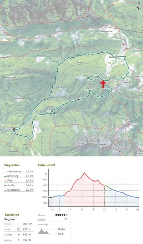 Wir haben für unsere Tour gesamt 6:30 h benötigt (incl. Pausen). Das ist gleich schnell als die Routenberechnung durch Outdooractive. Die Runde führt über 900 Hm und gut 16 km Wege und Steige.