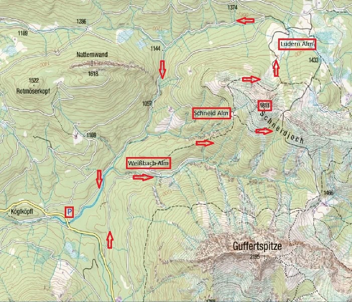 grundlegende Richtungen der Wanderung auf der Runde rund um das Schneidjoch in den Brandenberger Alpen
