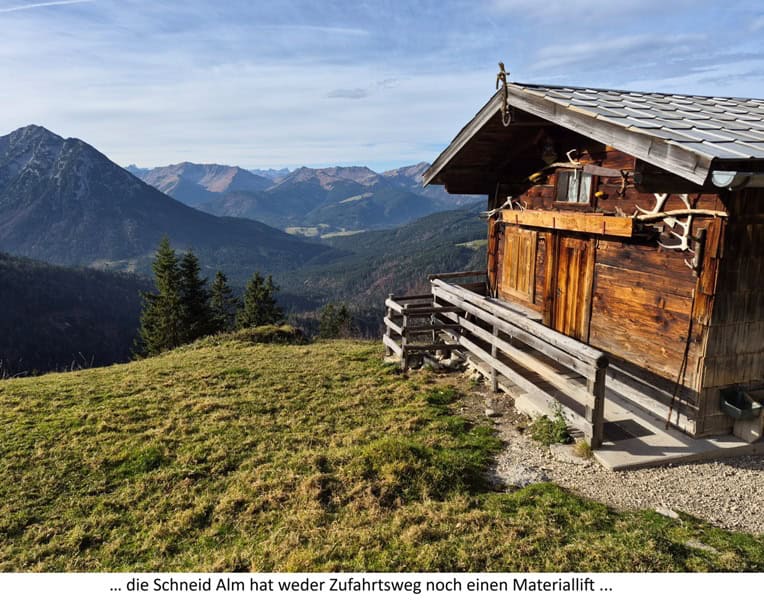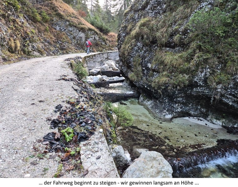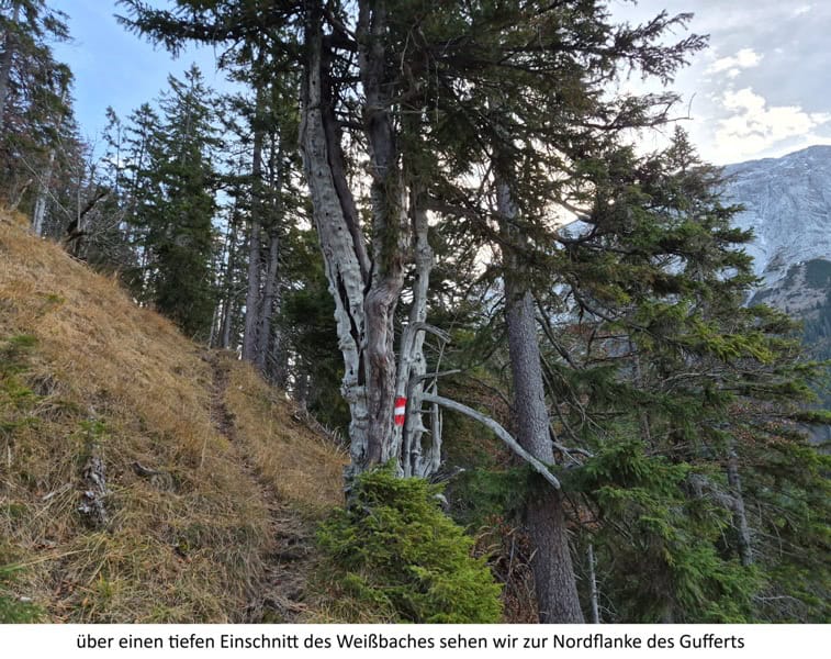 Ein wenig umständlich ist der Zugang vom Parkplatz der Gufferthütte zum Almweg auf die Weißbachalm sowie auf die Schneidalm. Um den Zugang zur Schotterstraße zu den Almen zu erreichen, muß neben der Landesstraße nach Steinberg etwa 800 m oder 10 min entlanggewandert werden, um die erste Möglichkeit über eine Rampe auf eine schmale Schneise zu gelangen, die auf die Schotterstraße führt. Der Steig in der Schneise stellt eine kleine Abkürzung des Abzweigs der Schotterstraße von der Landesstraße dar und verkürzt den Aufenthalt neben der Landesstraße um 400 m.
