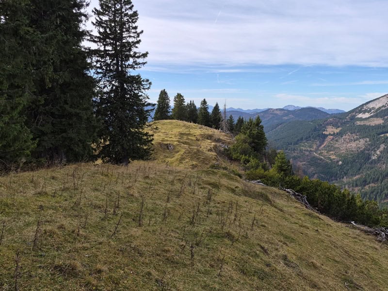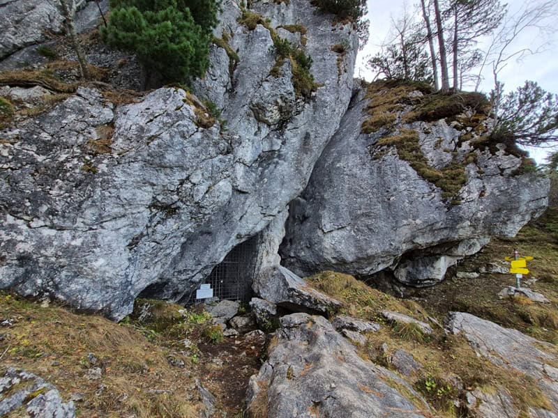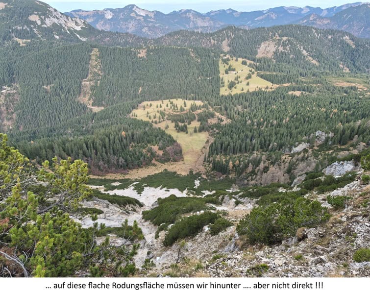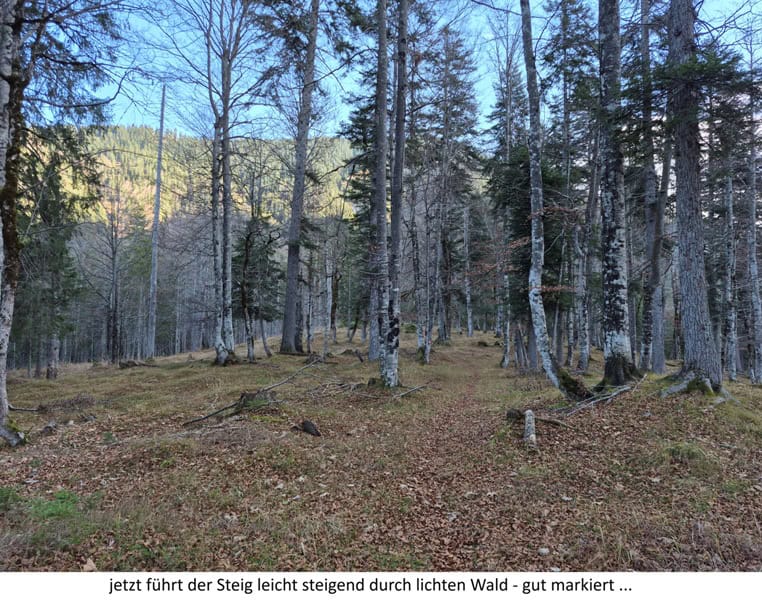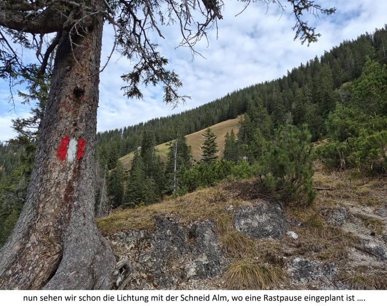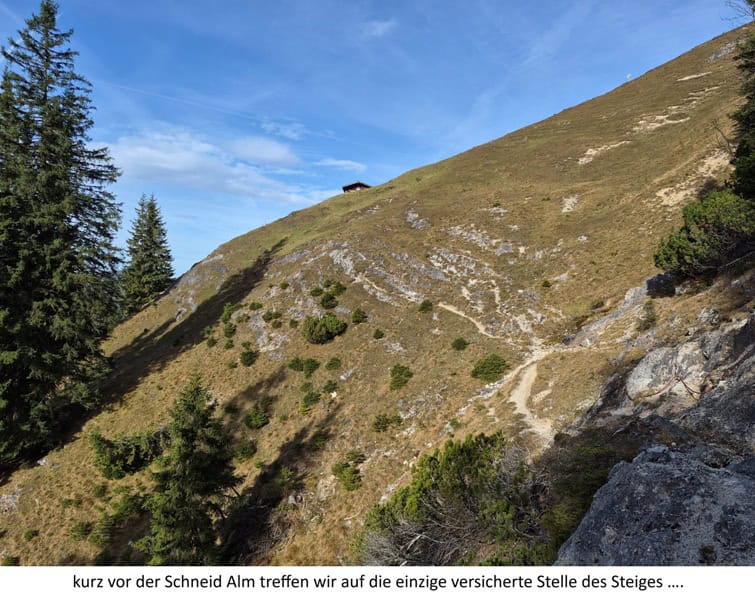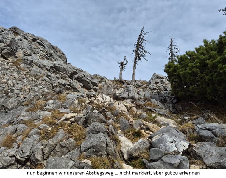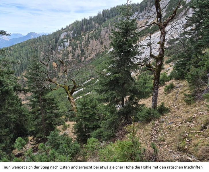 Alternativ dazu, bei zweifelhaften Verhältnissen, kann der wenig steile Rückweg zum Übergang in die Angernalm angetreten werden und über selbige abgestiegen werden. Diese Route führt ebenfalls zu den rätischen Inschriften, oder auch über die Klausbodenalm.