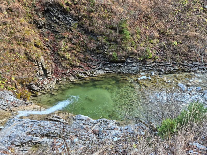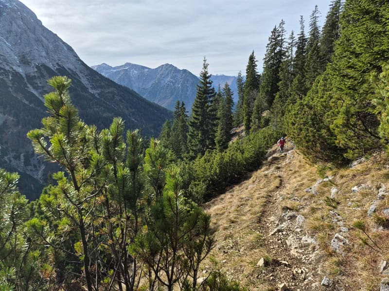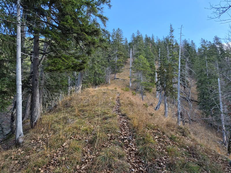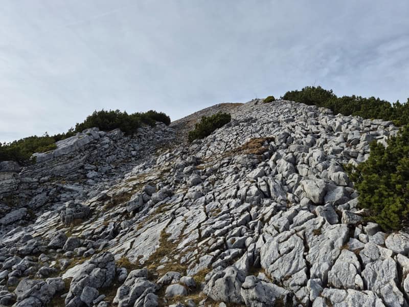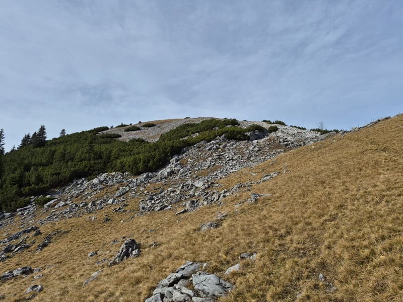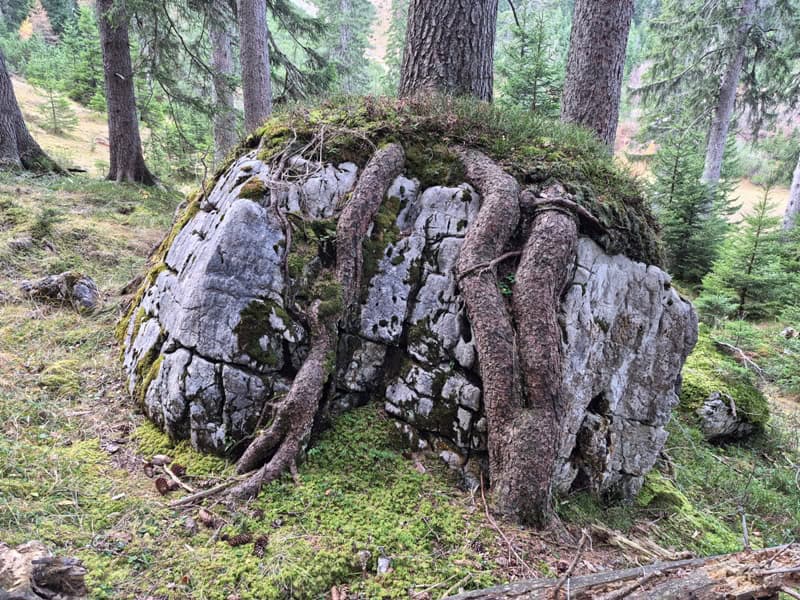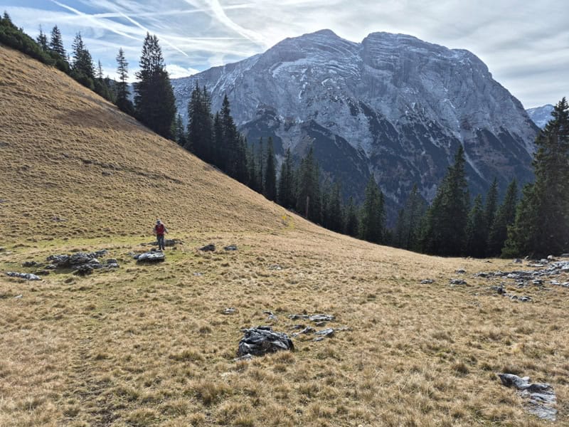 Alternativ dazu, bei zweifelhaften Verhältnissen, kann der wenig steile Rückweg zum Übergang in die Angernalm angetreten werden und über selbige abgestiegen werden. Diese Route führt ebenfalls zu den rätischen Inschriften, oder auch über die Klausbodenalm.