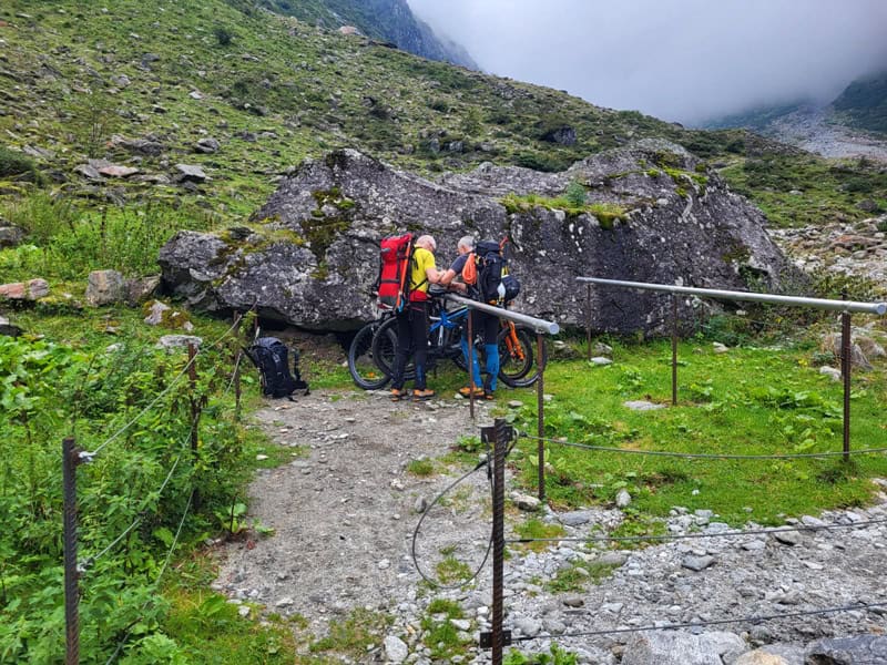 Für die lange Strecke mit dem nicht unerheblich schweren Gepäck liehen wir uns Stromradln aus, um den fahrbaren Teil des Floitentals angenehm aufzusteigen. Wer ein halbes Dutzend Dezennien am Buckel trägt darf diese Prothese in Anspruch nehmen. Wie von Taranteln gestochen radelten die Kameraden auf- und taleinwärts, sodaß jegliche Fotokulisse im wilden Floitental sorgsam überlegt und kurz gehalten werden mußte.