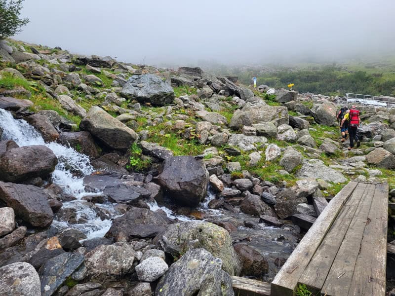 Der Aufstieg zur Greizer Hütte zieht sich im unteren Teil über den brockenübersäten Talschluß, der mit seiner Länge an Steilheit zunimmt. Vor der Steilstufe zur Greizer Hütte zweigt der Steig über die Mörchenscharte zur Berliner Hütte inmitten der Bachläufe ab. Im Getöse der Bäche folgten wir wortlos unserem Ziel auf die linke Talflanke zustrebend. Die Fachwerkbrücke über den Floitenbach wies den Weg in den Nebel auf nach Westen auf die Mörchenscharte.