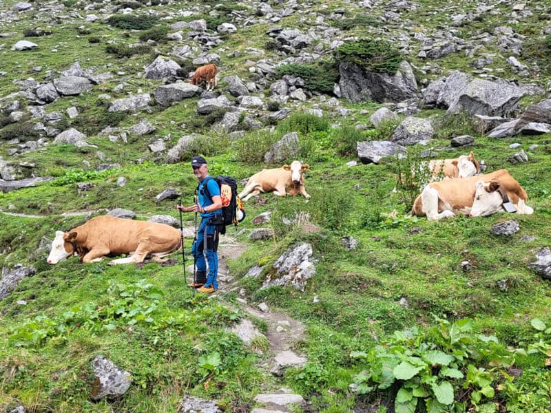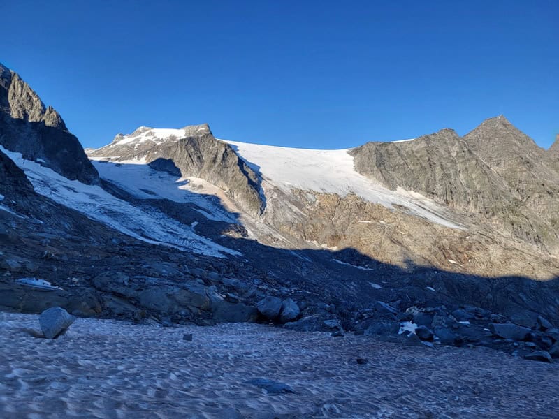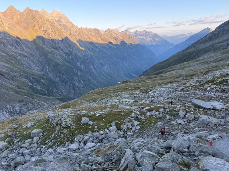 Der Steig führt zunächst über das sogenannte Griesfeld, dessen Name auf die großformatigen gneisiger Felsplatten zurückzuführen sein mag, über die sich die Routenführung hinan zieht. Mit moderater Steigung durchquerten wir diesen Abschnitt und erfreuten uns am frühmorgendlichen schattigen Panorama, geziert an den Graten von leuchtenden Gipfeln.