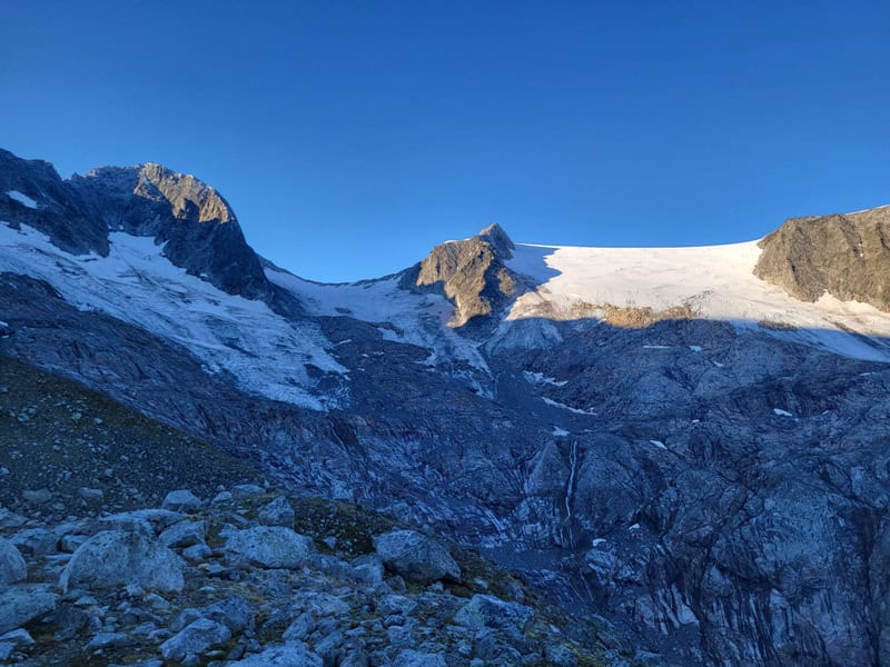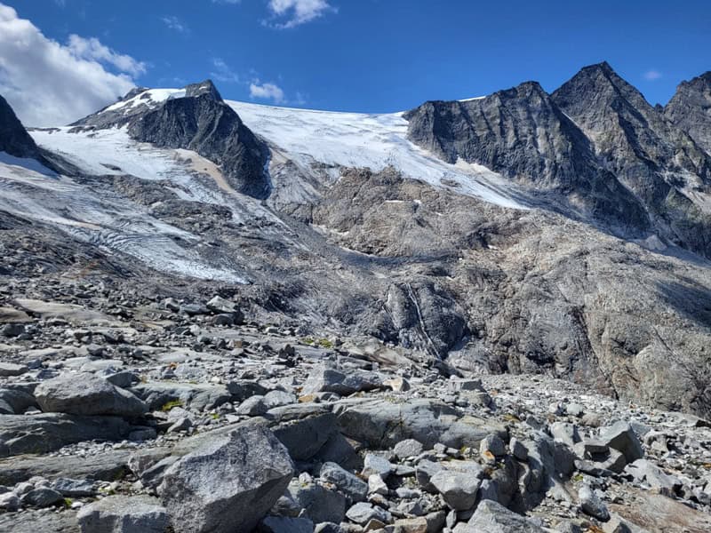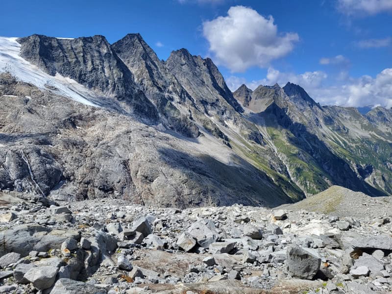 - die grobblockige Moräne von oben mit schön beleuchtetem Mörchnerkamm