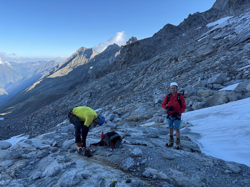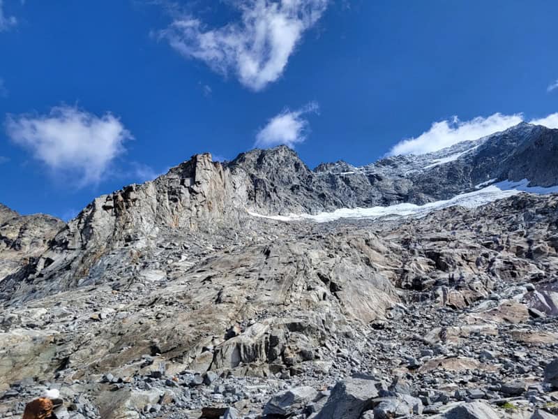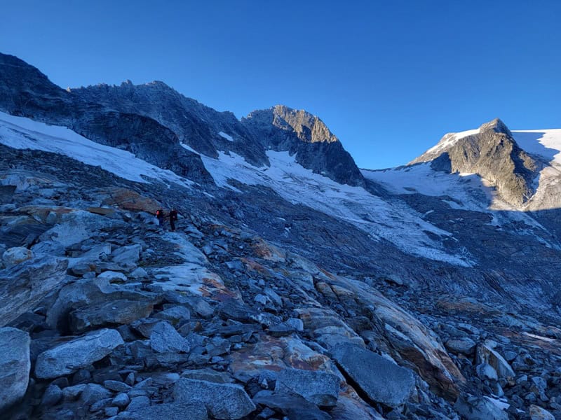 Über blockigem Terrain erreichten wir Felsgelände, knapp unterhalb des Eisrandes. Wie auch am Großen Möseler befindet sich der Eisrand etwa auf 2.700 m Seehöhe, durch die eher abgeschattete Lage vielleicht noch geringfügig darunter.