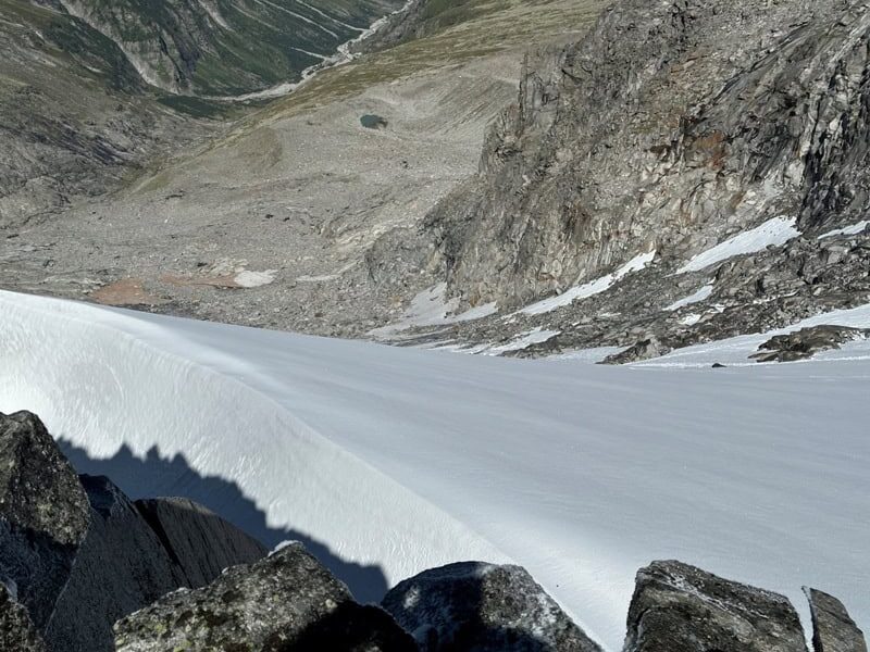 Während der Begehungen des Keeses stuften wir die kleinen Abbrüche in der Ostflanke nicht als gefährlich ein, kein Brocken trat bis in die Eisfläche ein.