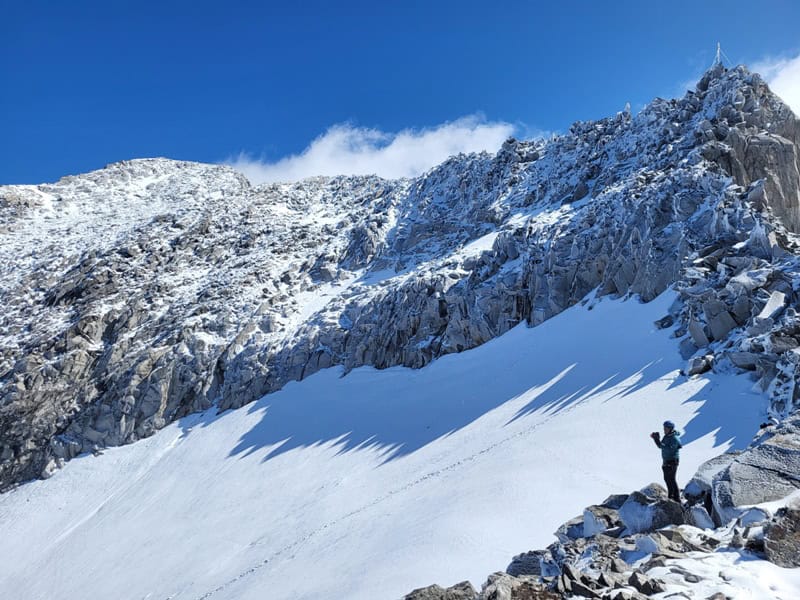 Nach dem verstauen des Seil in einem Depot am Felsrand machten wir uns mit Steigeisen auf den Grat und knirschten über die Felsblöcke. Leider ließen wir uns von den Blöcken auf die Nordseite leiten und stellten nach wenigen Minuten fest, daß die Flanke uns wieder hinunter drängen will und kein einfacher Durchstieg durch eine Verschneidung vor uns lag, die direkt zum Schrund leitete und nach oben hin zu glatt zum Durchsteigen war. Also entschieden wir den Rückzug, um den Normalaufstieg in Augenschein nehmen.