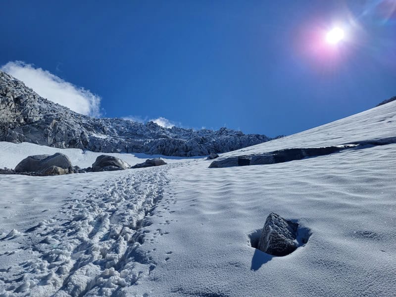Die ersten Firnschuppen konnten wir trotz hart gefrorener Oberfläche noch ohne Steigeisen begehen und das war auch die richtige Entscheidung, um über die glatt geschliffenen Klippen darüber hinweg zu kommen.