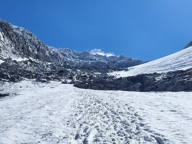 Beide Felseinschübe bringen im Aufstieg etwas Abwechslung in die Steigarbeit. Einerseits müssen sie umgangen werden und ändern die monotone Direttissima, andererseits bricht dort das Eis und Spalten, wenn auch in geringem Ausmaß und Tiefe, werden sichtbar.