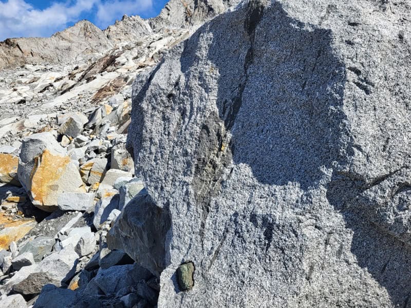 Unter schöner Sonnenbestrahlung machten die Funde an Blöcken mit verschiedensten Xenolithen und Ganggesteinen wieder richtig Freude und ließen die Enttäuschung über die verpatzte Besteigung vergessen. Auch diese Größe muß der Bergsteiger haben und er weiß das alte Sprichwort, daß der Berg nicht davonläuft.