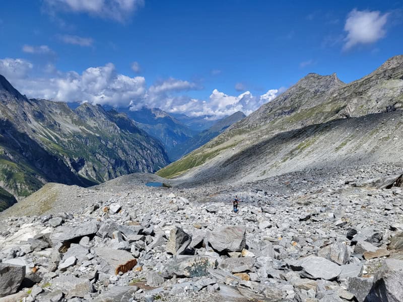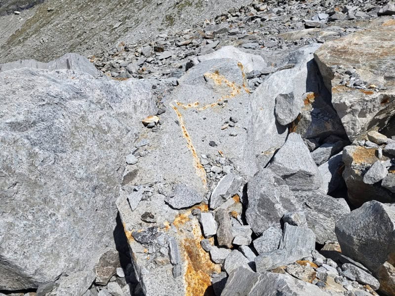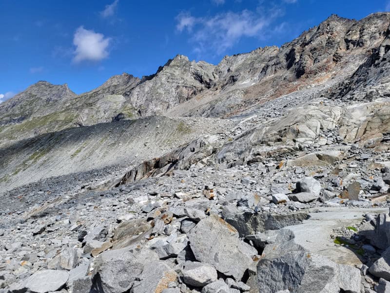 In einer Zone granitischer Brocken, die ein völlig anderes Bruchverhalten zeigen und den Übergang in den sogenannten Zillertaler Kern markieren, erklimmt der Steig die erste deutlich erhobene Moränenkrone auf etwa 2.500 m und ein kleiner Gletschersee wird sichtbar. Ein großer Steinmann markiert die Route. Etwa 100 m höher geht das Brockenfeld in felsiges Gelände über, das von schönen Schliffformen geprägt ist.