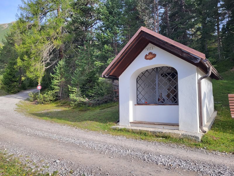 Neben der Wallfahrtskirche weist auch die Flurbezeichnung Kohlstatt auf frühen Bergbau in der Region hin, da Holzkohle immer zur Verhüttung von Erz benötigt wurde. Der Blick gen Süden zeigt bereits die mächtigen Spitzen von Acherkogel, Strahlkogel und Breitem Grieskogel.