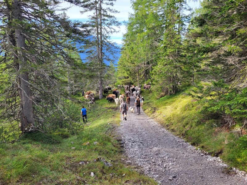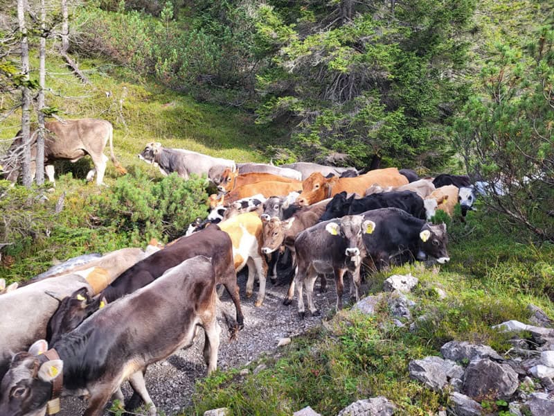 So rasch der nette Kindergarten herannahte, so rasch war er auch schon durchgezogen, hinten nach den seitlich ausbrechenden Tieren die Marschrichtung weisend, stoisch die Hirten und Bauern ohne jede Hektik. Ein nettes, seltenes Erlebnis. Kurz darauf erreichten wir die Kälberhütte, wie hätte es anders sein können.