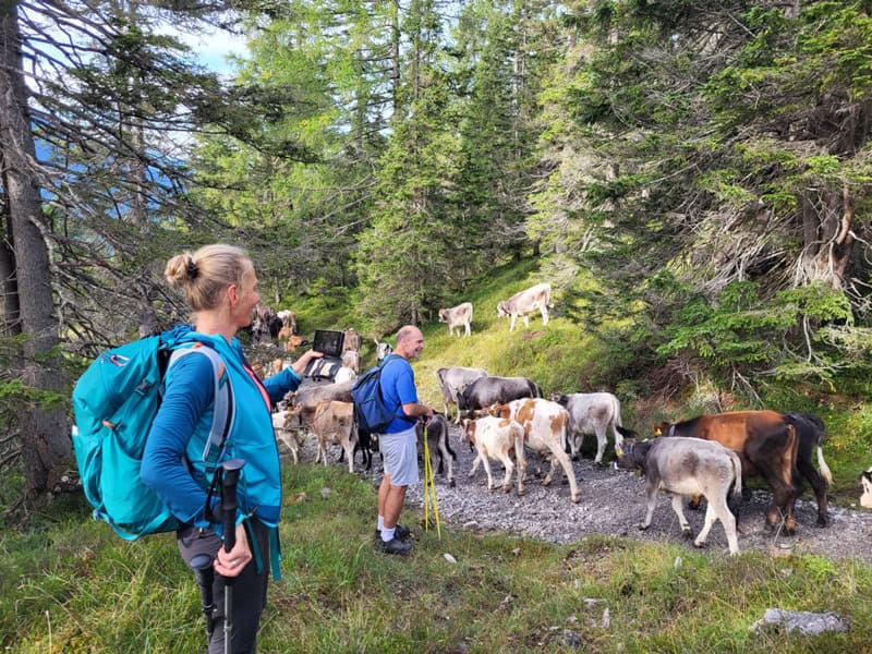 Zum Sinnesjoch führt die Schotterstraße über hügeliges Gelände weiter. Vereinzelt durchstreift man am Weg Alm-Freiflächen, darunter eine größere, auffallend flache. Am Weg dorthin wurden wir Zeugen des Almabtriebs von Galtvieh, das sich plötzlich mit lautem Gebimmel ankündigte und im Pulk den gesamten Weg vereinnahmte. Die lustigen Kinder waren zudem an allem interessiert, was sich links und rechts des Weges befand und so mußten wir regelrecht auf die Flanken des Weges ausweichen, um vom Tross nicht mitgerissen zu werden.