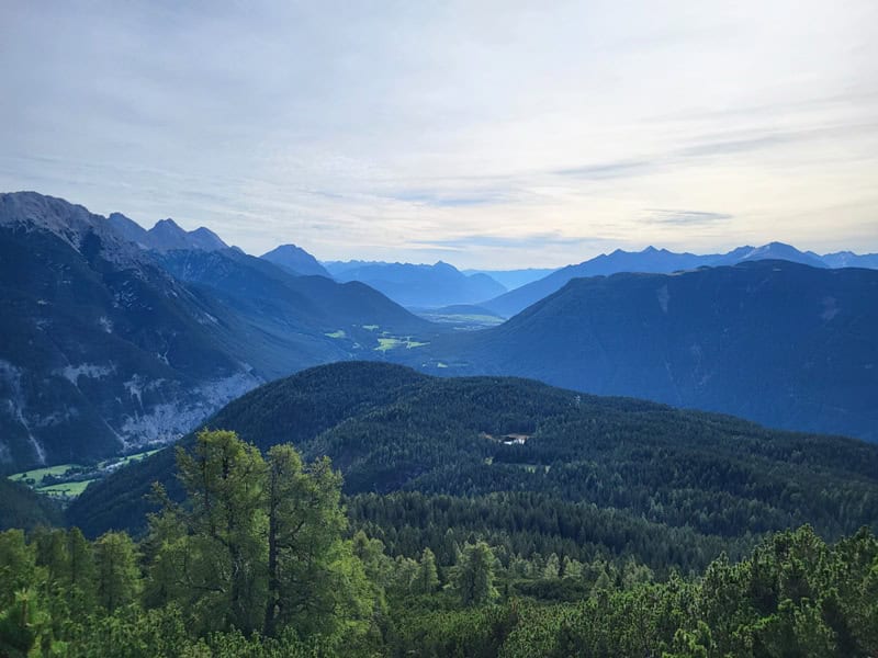 herrliche Ausblicke vom Gurgltal über den Holzleiten Sattel bis zur Martinswand; im Vordergrund der Kohlstattsee