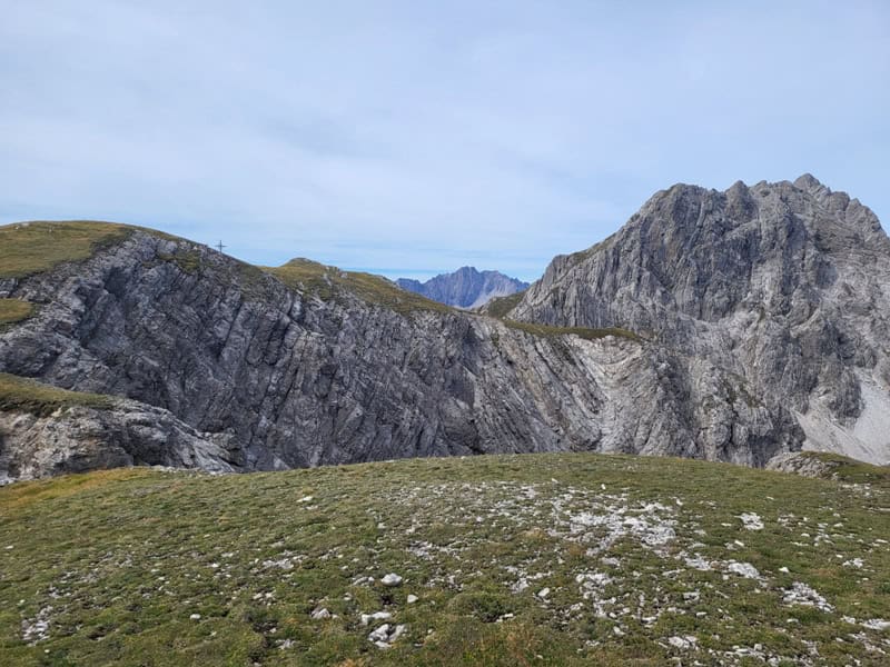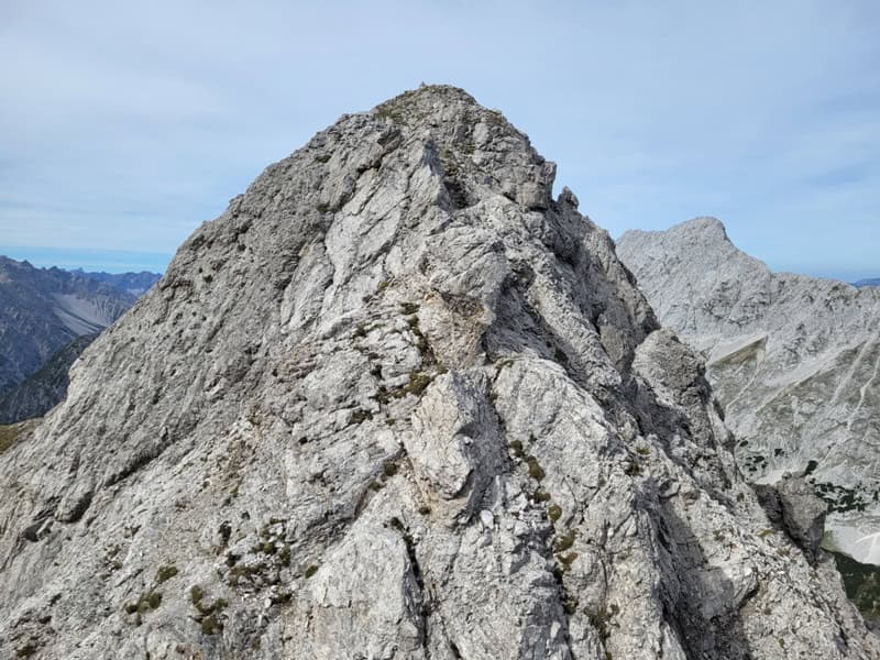 Jedenfalls ziert sein nordöstlichstes Spitzchen ein Gipfelkreuz, das auf Gratbegehungen hindeutet, die der alte AV-Führer von 1975 auch beschreibt und den kleinen Gipfel Reißenschuhkopf2 nennt.