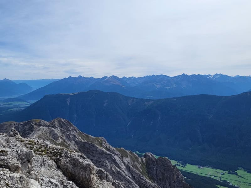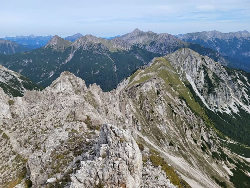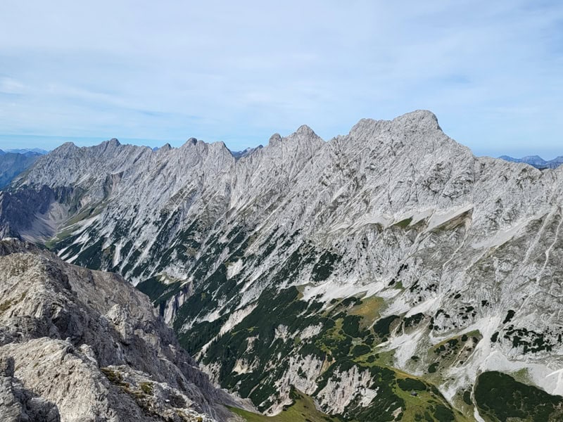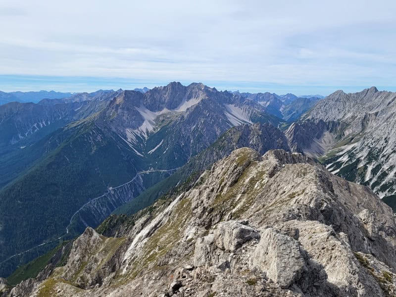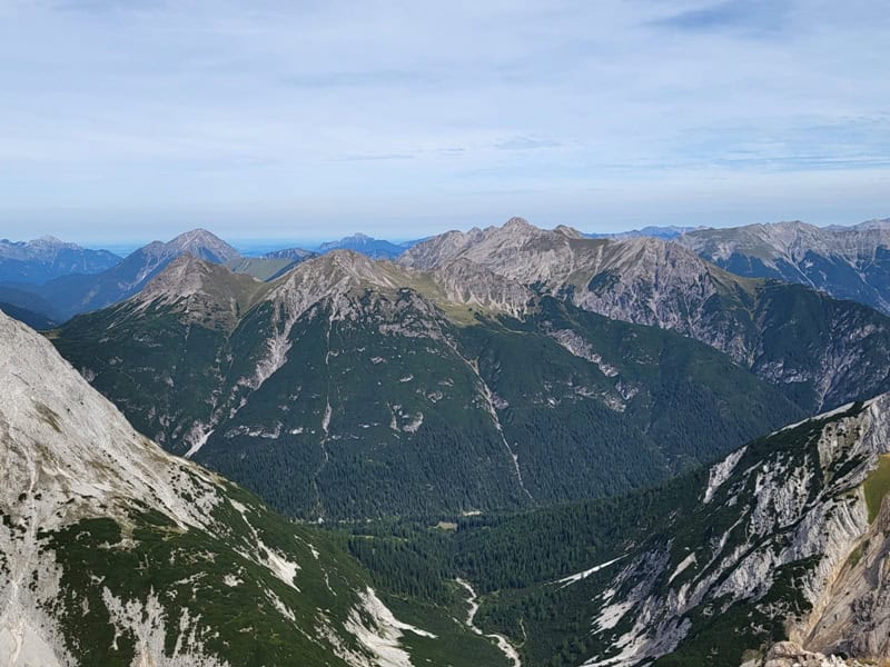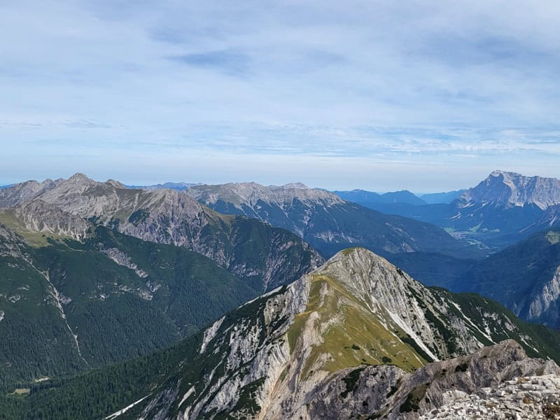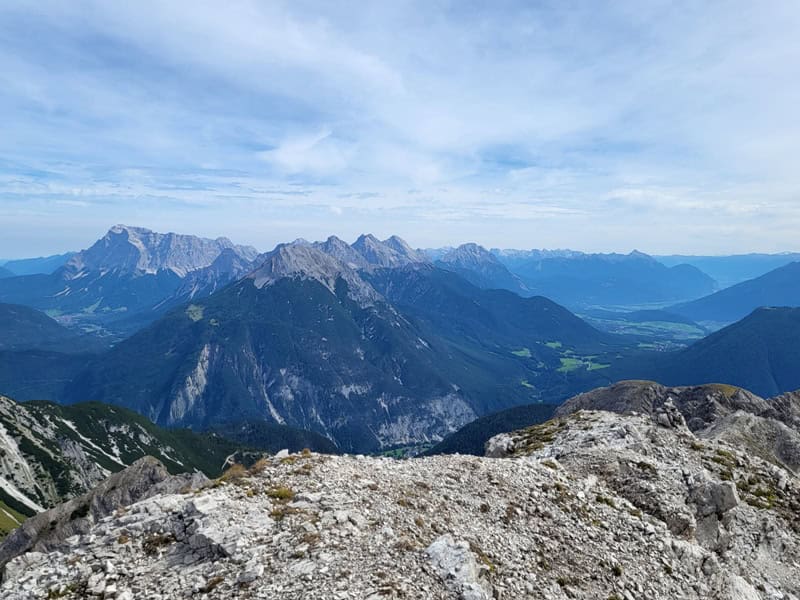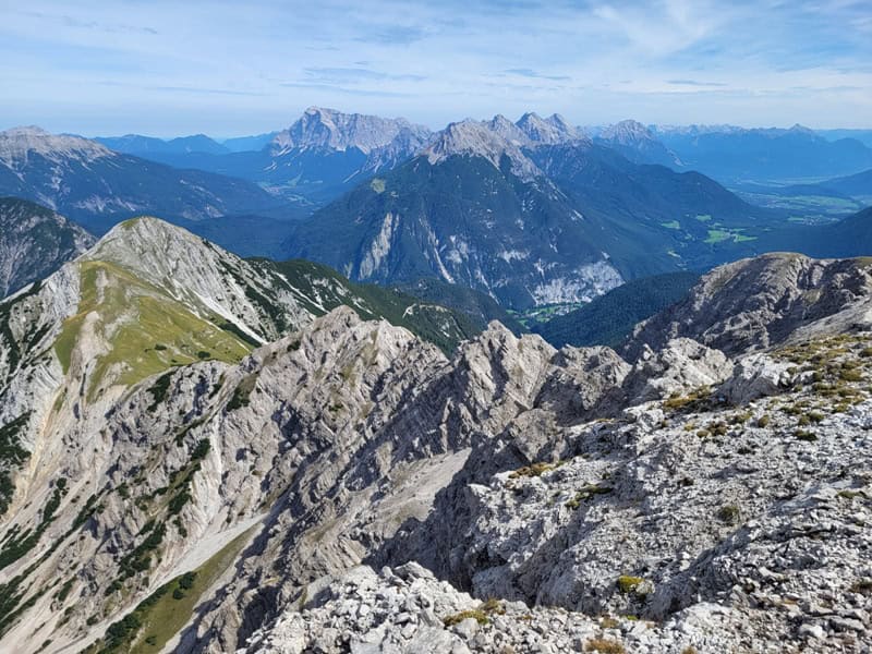 Das kolossale Zugspitzmassiv mit der gewaltigen Mauer von der Wetterspitze bis zu den Gatterlköpfen beeindruckt im Nordosten sowie die fast schon verborgende Wettersteinhauptkette mit dem zweithöchsten Berg Deutschlands, dem Hochwanner, dessen brüchiger Normalaufstieg vom Gaistal aus unternommen wird. Im Vordergrund die schönen und leichten Kletterziele der Mieminger Kette mit der Ehrwalder Sonnenspitze, den Marienbergspitzen sowie die Westliche Mitterspitze und die freistehende Hohe Munde vervollständigen das schöne Bild in den Osten. Natürlich sind die Karwendelgipfel nicht zu vergessen, das auf diesem Blog am vollständigsten beschriebene Gebirge.