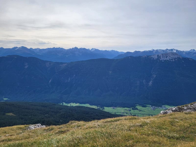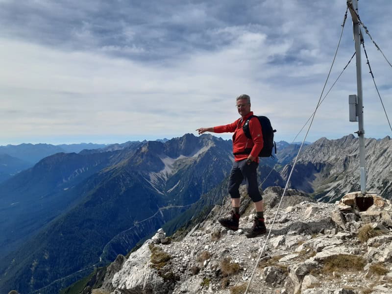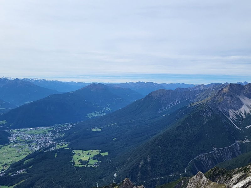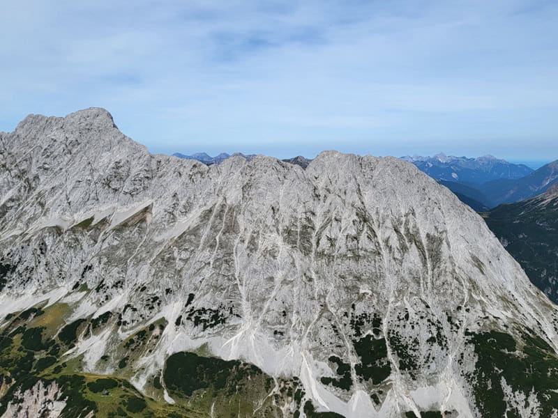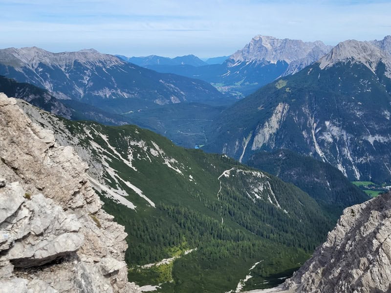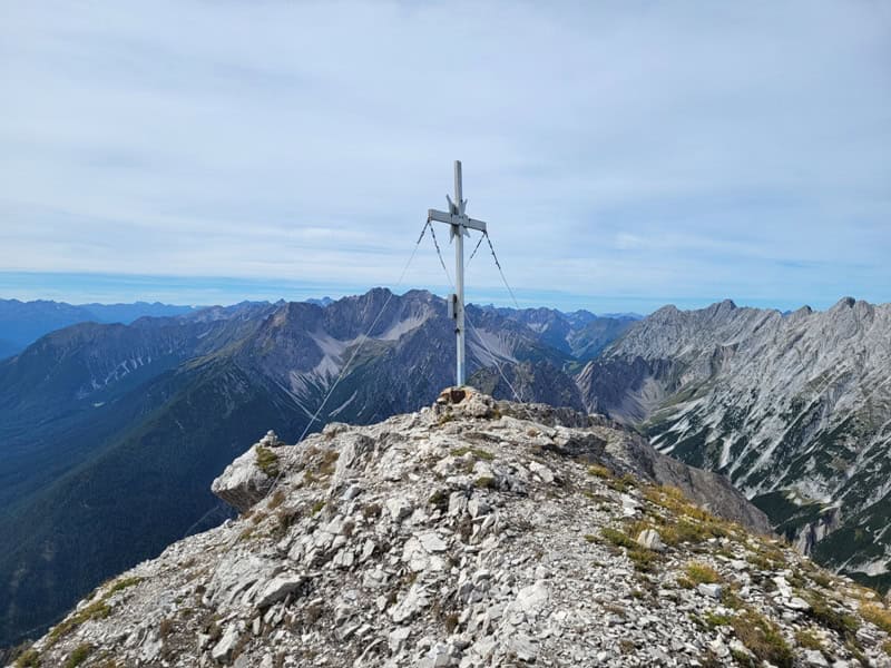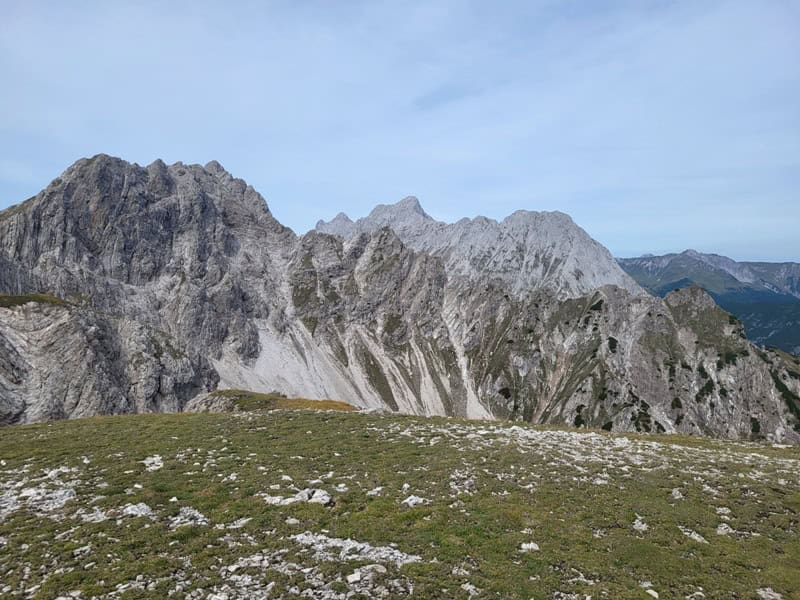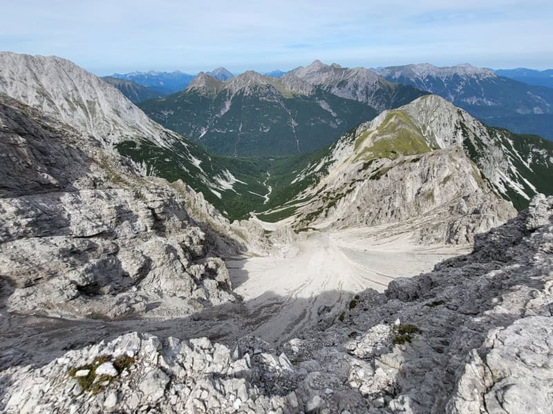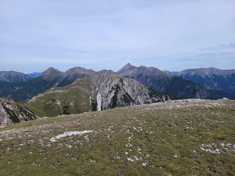 Das kolossale Zugspitzmassiv mit der gewaltigen Mauer von der Wetterspitze bis zu den Gatterlköpfen beeindruckt im Nordosten sowie die fast schon verborgende Wettersteinhauptkette mit dem zweithöchsten Berg Deutschlands, dem Hochwanner, dessen brüchiger Normalaufstieg vom Gaistal aus unternommen wird. Im Vordergrund die schönen und leichten Kletterziele der Mieminger Kette mit der Ehrwalder Sonnenspitze, den Marienbergspitzen sowie die Westliche Mitterspitze und die freistehende Hohe Munde vervollständigen das schöne Bild in den Osten. Natürlich sind die Karwendelgipfel nicht zu vergessen, das auf diesem Blog am vollständigsten beschriebene Gebirge.