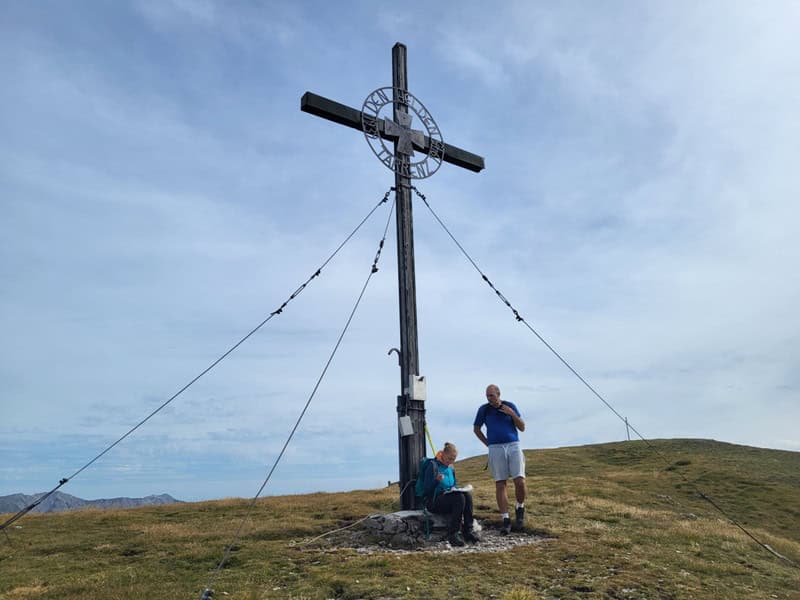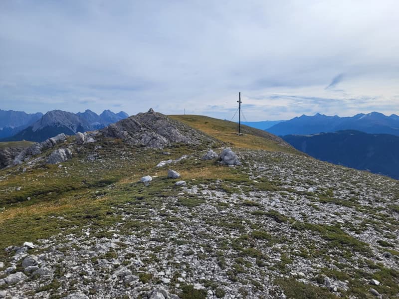 Dem Latschengürtel im Aufstieg folgend steilt der nur mehr grasbewachsene Gipfelaufbau auf das Sinnesjoch noch einmal auf. Durch einen flachen Einschnitt verläuft der Anstieg auf ein flaches Plateau, das nur noch durch einen kleinen Sattel mit dem weiten Sinnesjoch getrennt wird. Von dort gelangten wir in wenigen Minuten zum Gipfelkreuz, das der Sichtbarkeit vom Tal aus halber nicht am Hochpunkt errichtet wurde.