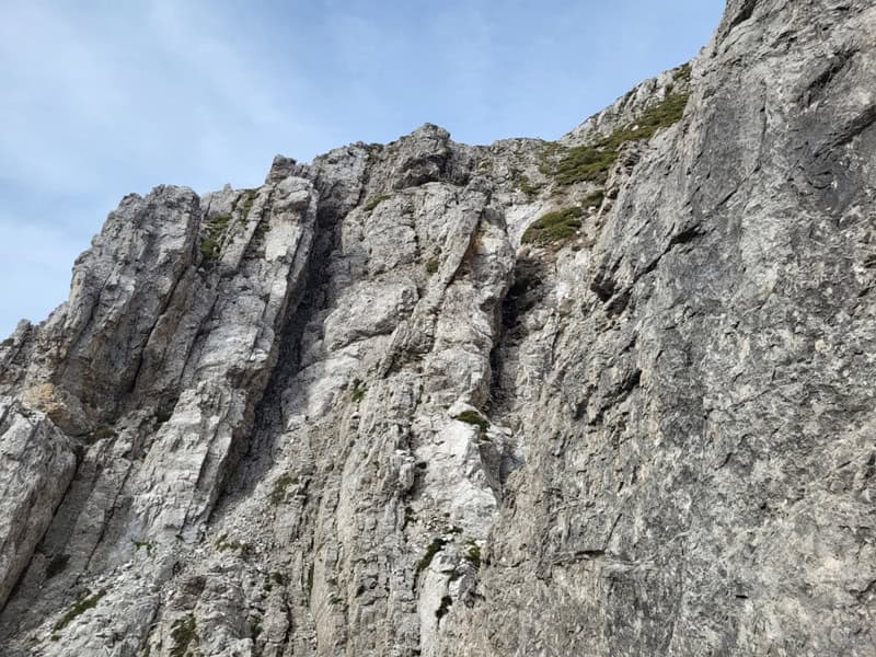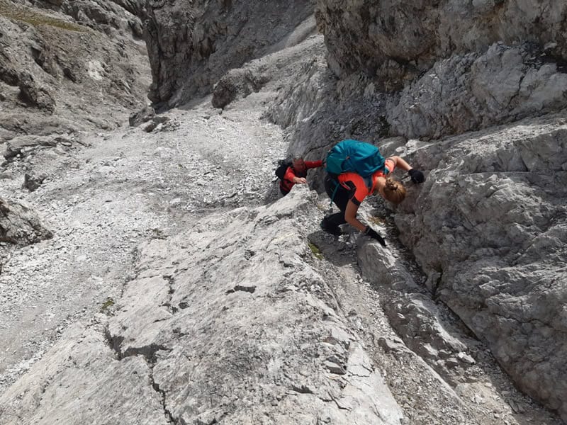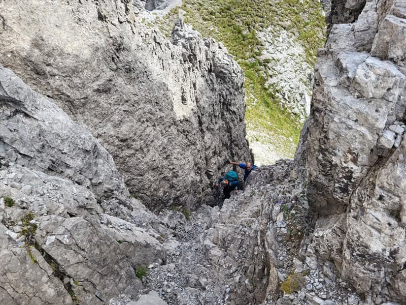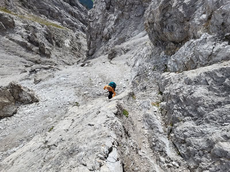 Trotz des an sich brüchigen Hauptdolomits bietet der Kamin durch seine häufige Begehung genügend Tritt- und Haltemöglichkeiten und leider währen seine senkrechten Flanken nur kurz, bevor oben bereits auf der Grathöhe ausgestiegen und der Plattenflucht ein paar Meter abwärts in eine Mulde gefolgt wird, die jenseits der Mulde in eine kurze Passage mit links Fels, rechts wiesendurchsetztes Schuttgelände mündet.
