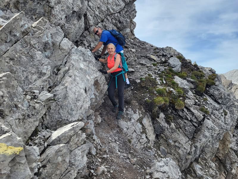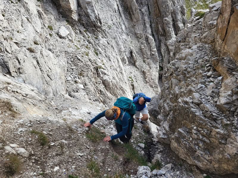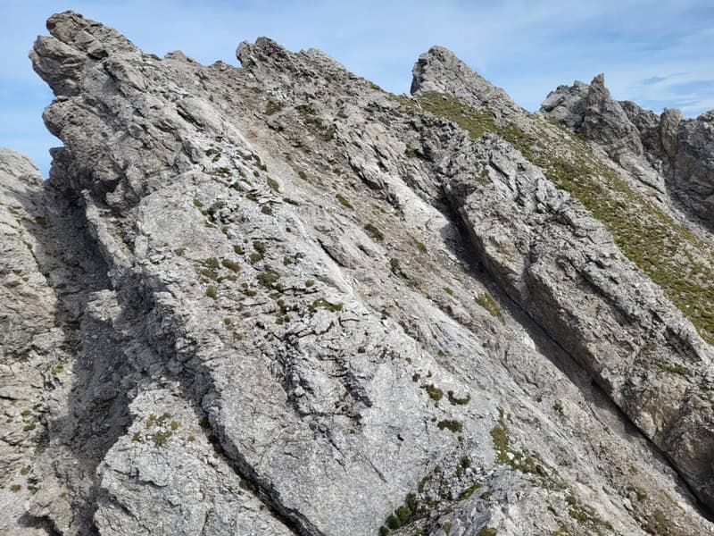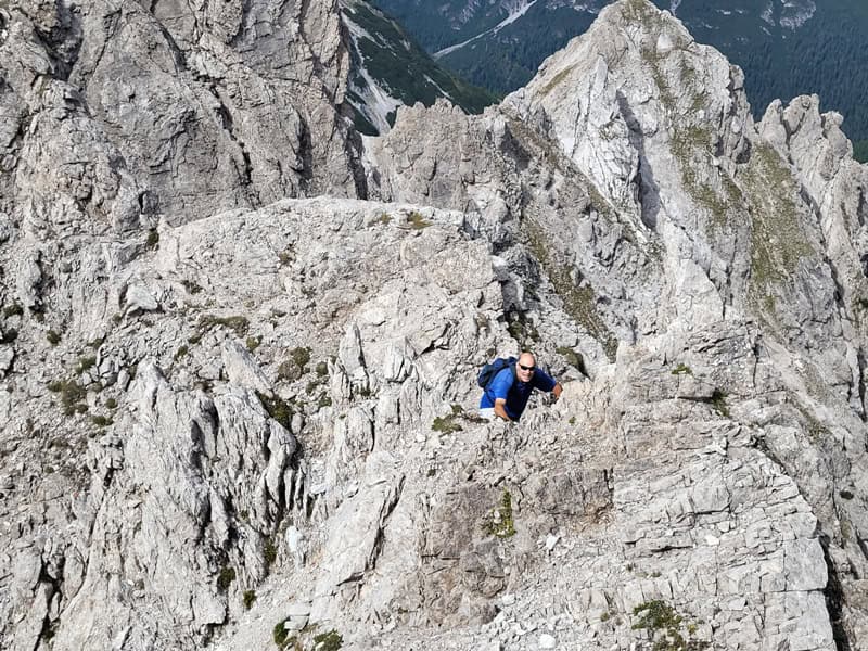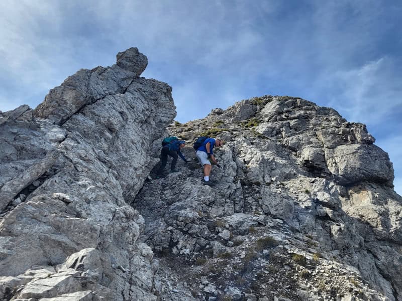 Zuerst wird der Kamm spitzer und die ersten Zacken südseitig untergangen, bevor sich an seinem Ende der flache Steig in einen tollen kaminartigen Steilaufstieg verwandelt. Diese Passage, die unter leichter Kletterei bewältigt wird, beflügelt und wir hofften mehr davon zu sehen.