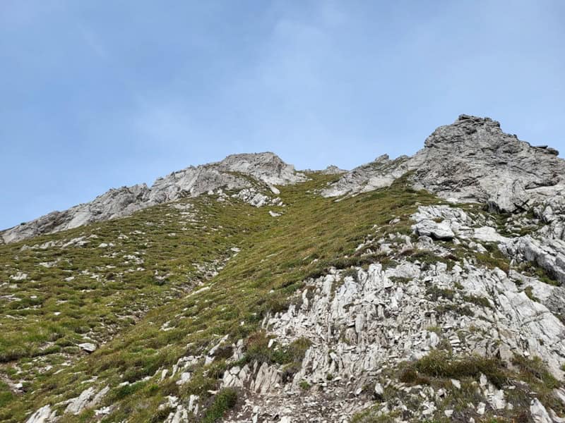 Anschließend folgt steiler Wiesenaufstieg mit deutlicher Ausprägung des Steigs, etwa über 90 Hm zur Grathöhe. Der schöne Rückblick zeigt die kurze Felsstrecke durch die gleichmäßig schräg gestellten Felsplatten mit dem Sinnesjoch im Hintergrund.