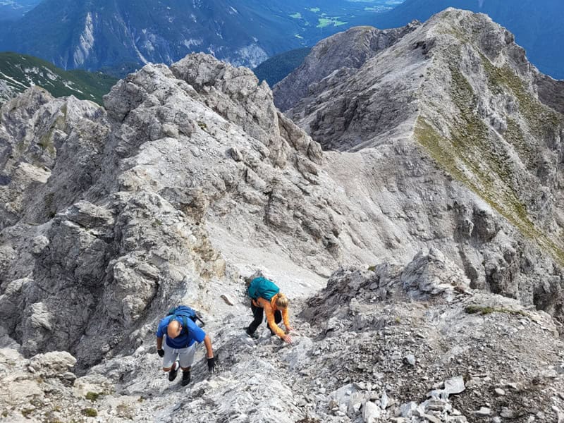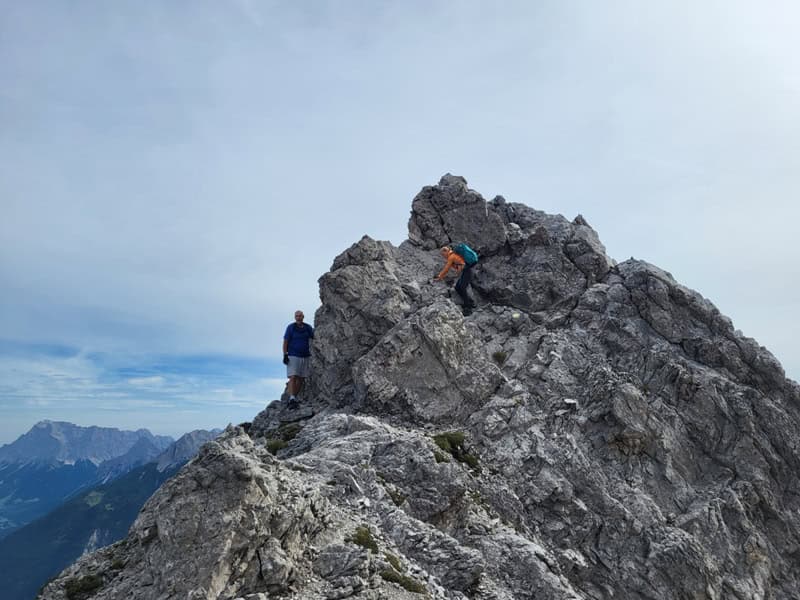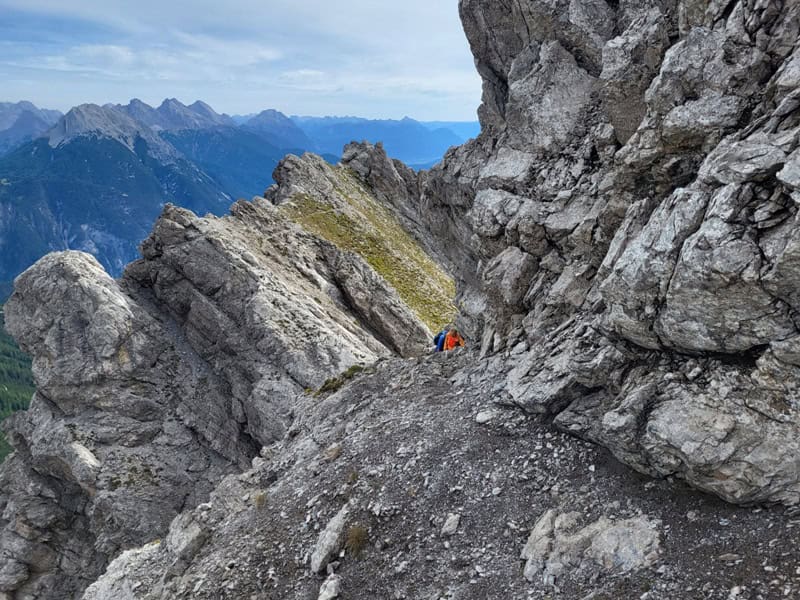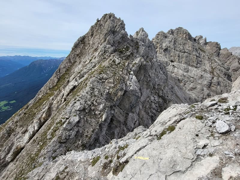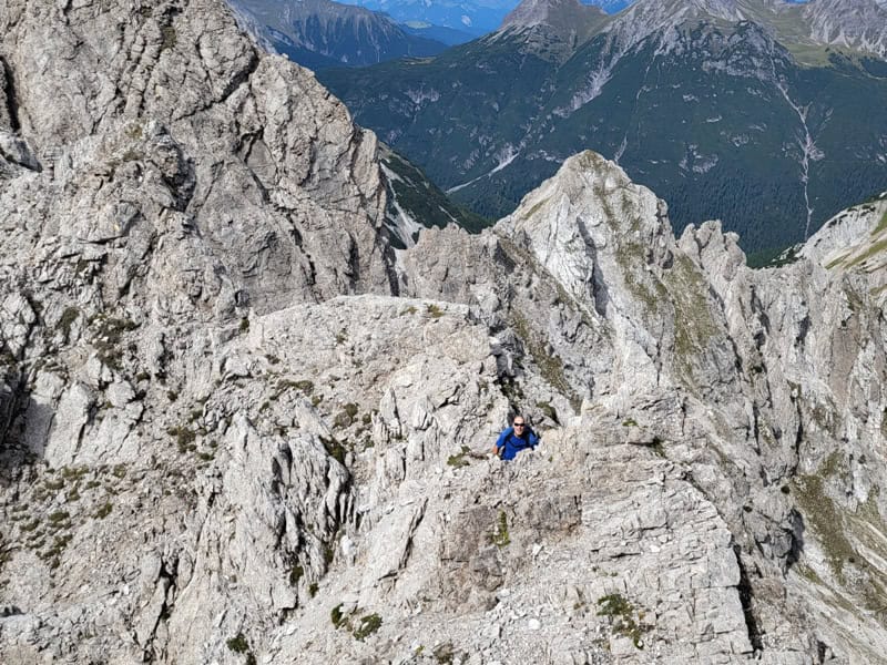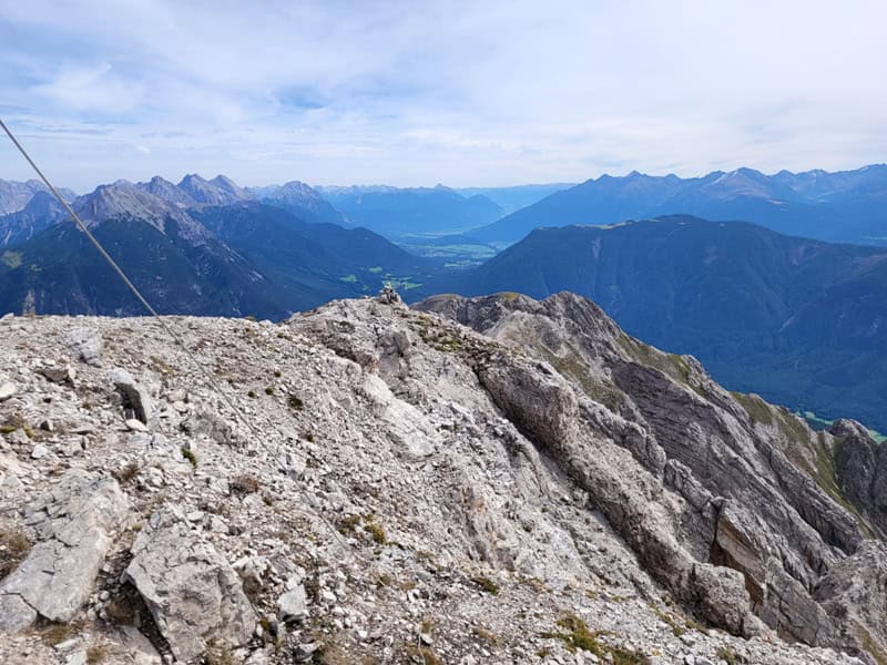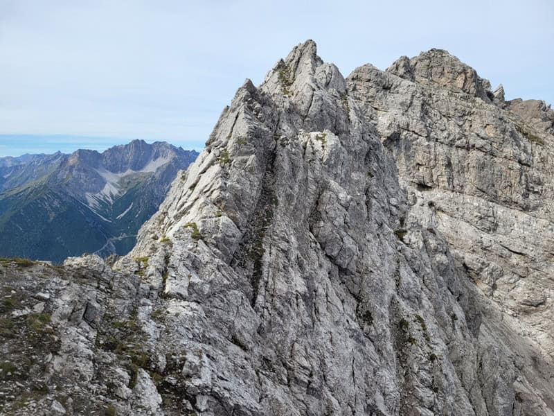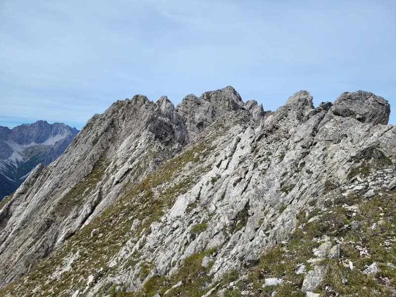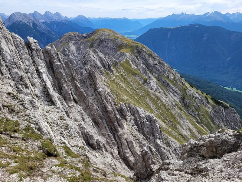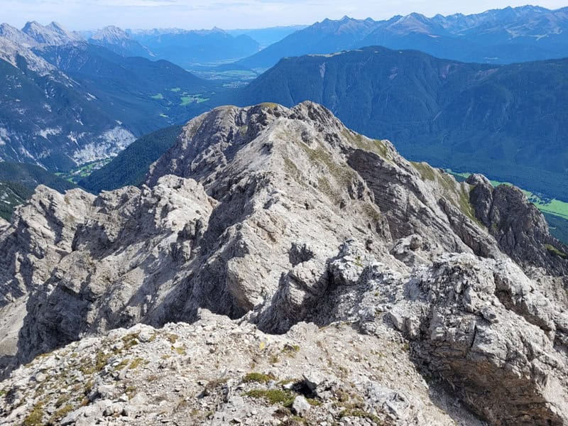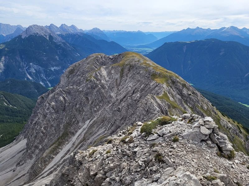 Am Hochpunkt der bisher einsehbaren Gratstrecke bietet sich nochmals der freie Blick auf das Sinnesjoch in der Tiefe sowie auf die Riesen der Mieminger Kette mit den eindrucksvollen Gipfeln des Grünsteins oder des Hochplattigs. Nach weiteren fünf Minuten des Aufstiegs hatten wir Grathöhe mit dem ersten Überblick über die weitere Gratstrecke und dem Sinneskopf im Vordergrund erreicht.