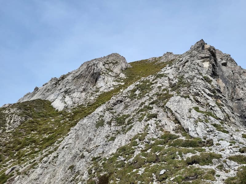 Aufgestiegen über die steile, schuttbedeckte Flanke und die Grathöhe erreicht, sahen wir wieder einem kurzen, nordseitigen Abschnitt entgegen.