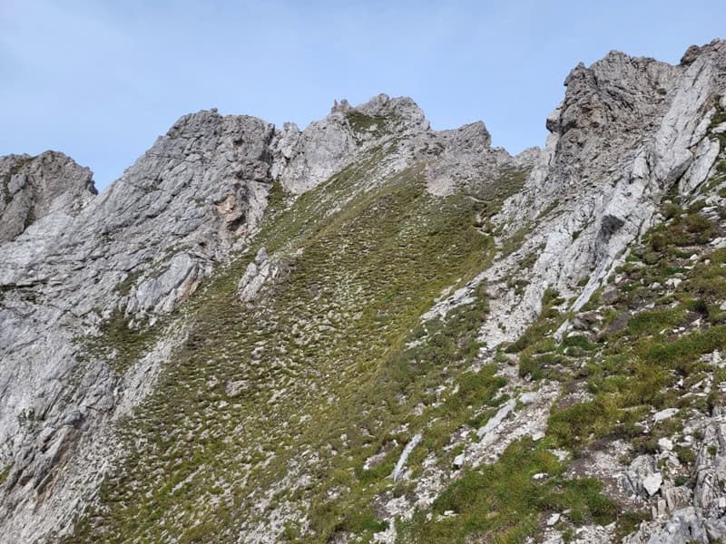 Vor einer etwas tieferen Einschartung erkennt man etwa 100 m weiter oben am Grat eine Passage, die nach Norden hinausführt, in die steil abfallende Nordflanke des Rauchbergs.
