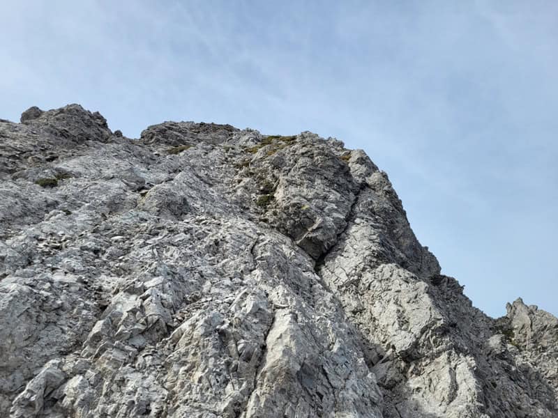 Am Felsansatz nach der Schuttstrecke bietet zunächst ein schräges und steiles Band, auf das man sich mit wenigen Kletterzügen aufschwingt, einen leichten Zugang zur von unten scharf anmutenden Scharte.