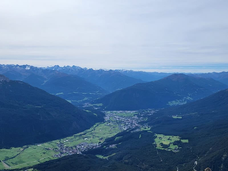 - südlich auf die nordwestlichen Stubaier Alpen und rechts auf die Ötztaler Alpen geblickt; mittig der Graben des Ötztals