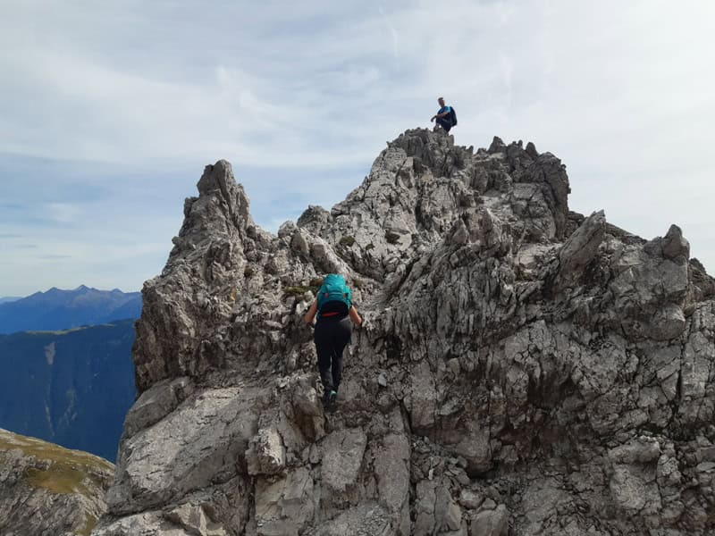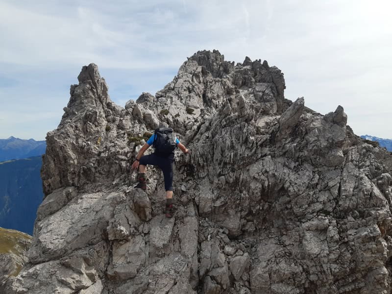 Nach einem angenehmen Wanderaufstieg zum riesigen Plateau am Sinnesjoch eröffnet der zerrissene Grat zum Rauchberg eine herrliche Gratkettentour mit einigen würzigen Stellen, die angenehm fordernd im Gedächtnis bleiben.