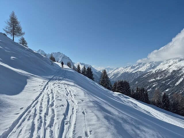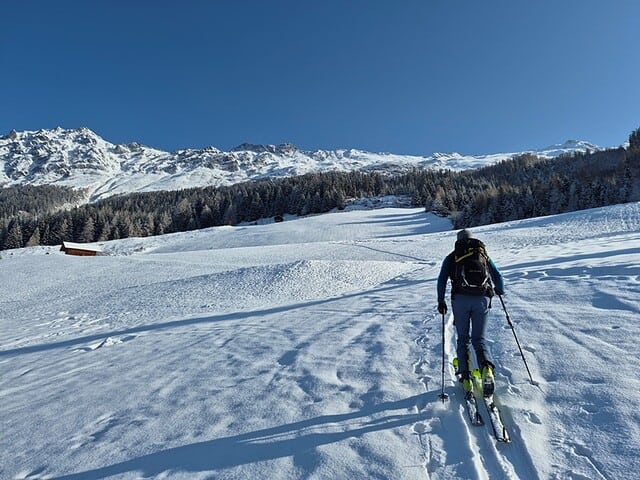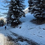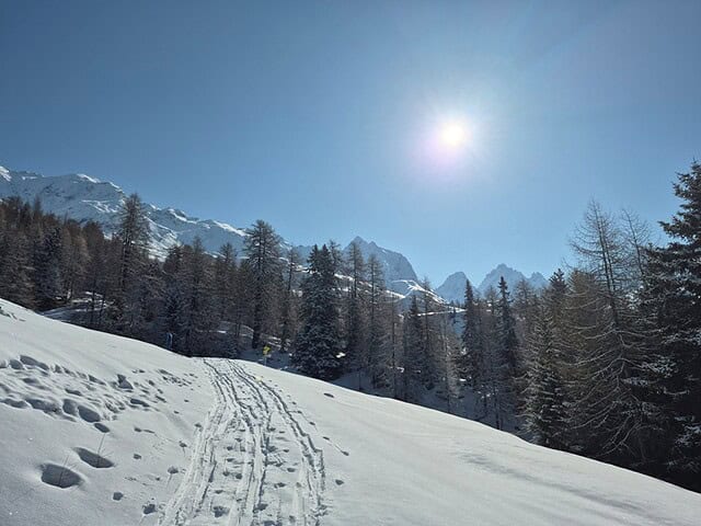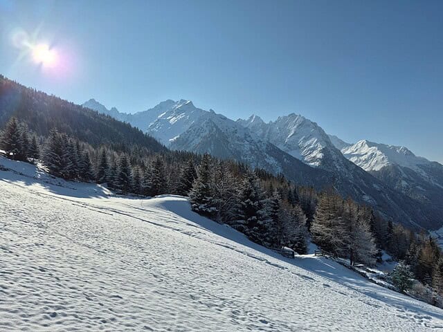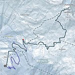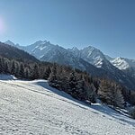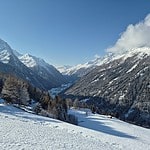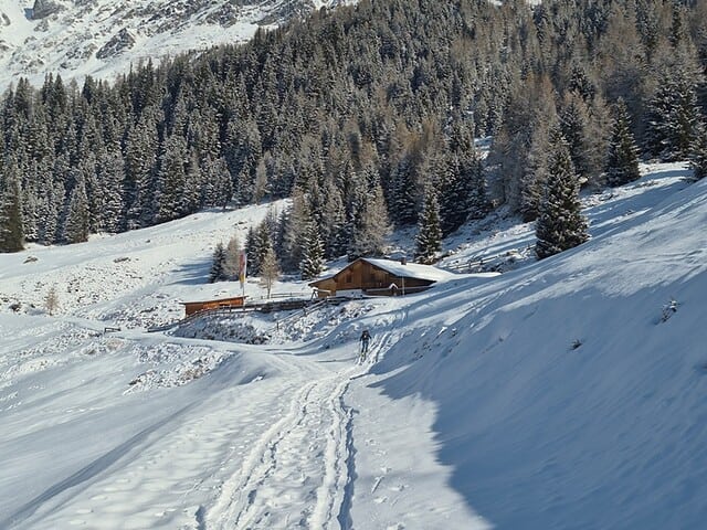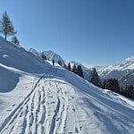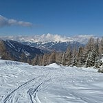- Blick auf die Schitour vom Freizeitzentrum in Feichten; die gesamte Route im oberen Teil einsehbar, die Schwarzwand im rechten Bilddrittel mit der langen Abfahrt bis tief in den Wald