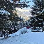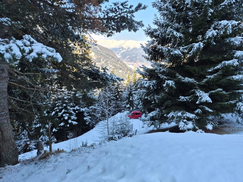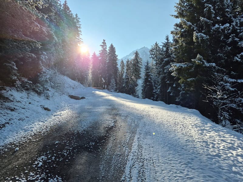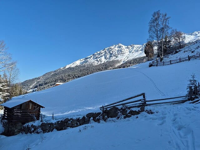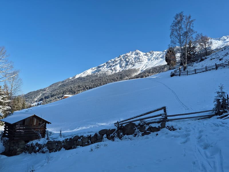 Schneefall über Nacht zauberte uns eine nette Landschaft, als wir über die Serpentinen der Gemeindestraße von Nufels auf den Kaunerberg fuhren, um den Parkplatz als Ausgangspunkt der Schitour auf das Stupfarriköpfle zu erreichen. Die Beschilderung in den Serpentinen verhindert das unabsichtliche Abzweigen auf Stichstraßen zu Bergbauernhöfen und leitete uns zur letzten Kehre vor dem Gehöft Wiesenhof, von der ein kurzer Stichweg zum vergrößerten Platz vor dem Schranken führt.