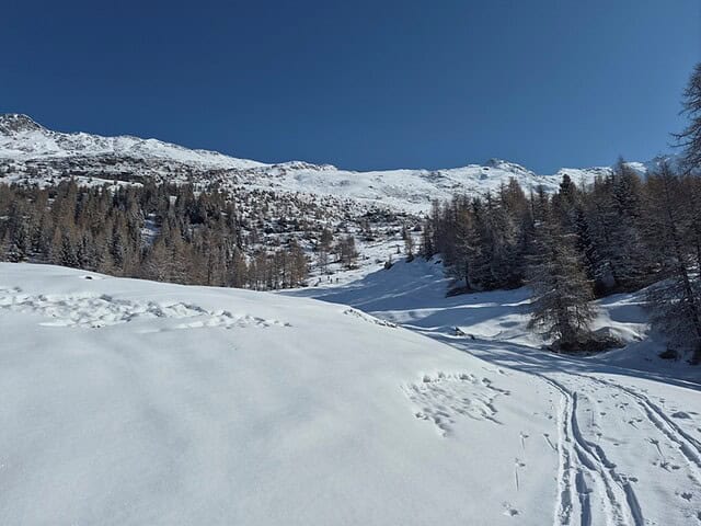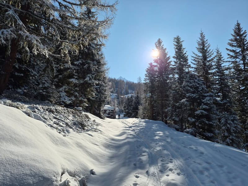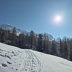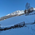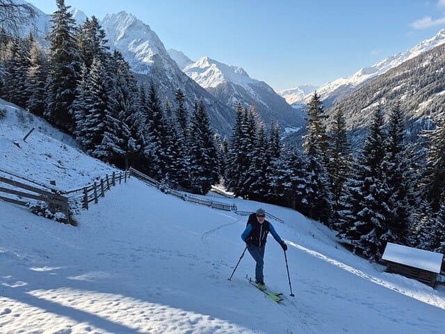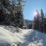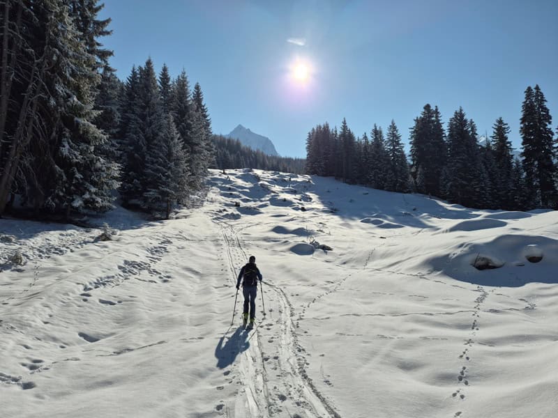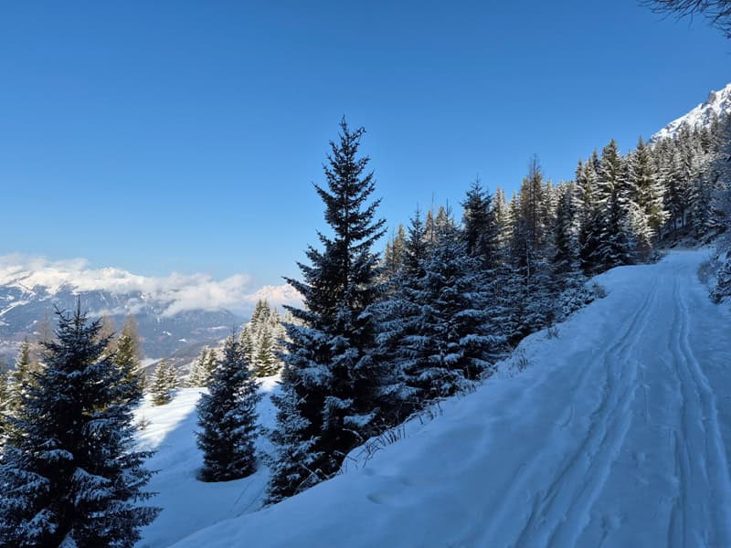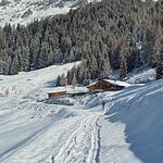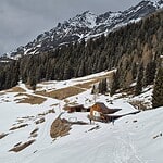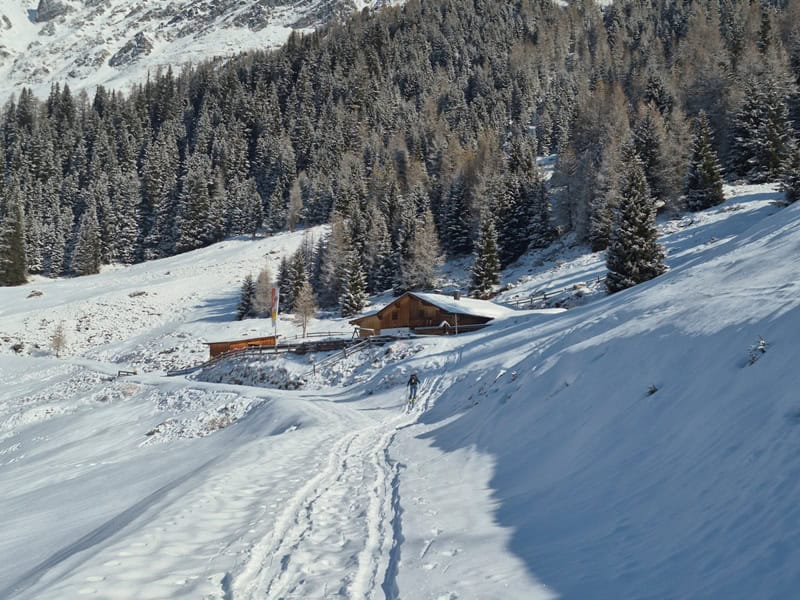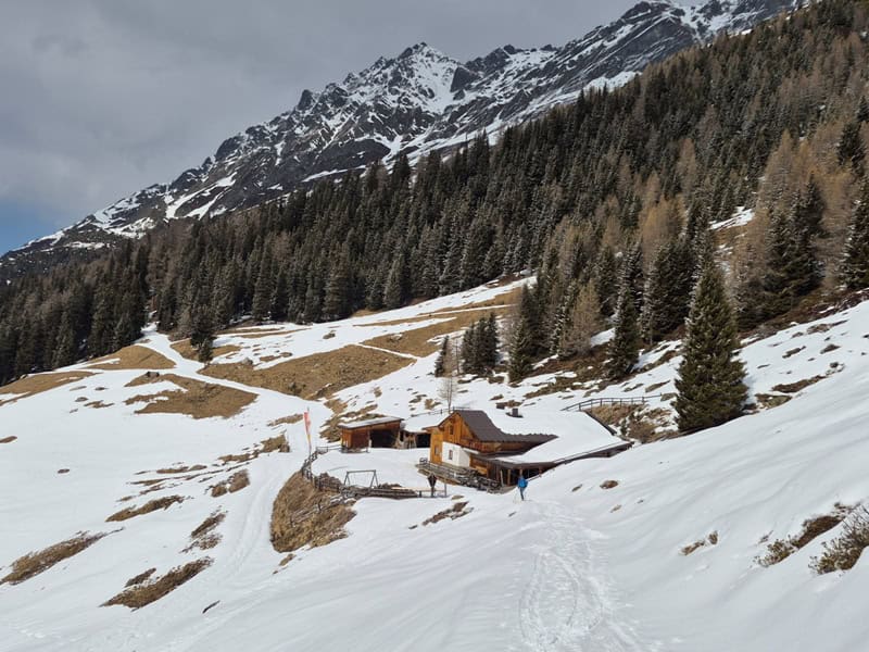 Trotz dem Ausgangspunkt auf knapp 1.600 m erwischten wir gerade noch genügend Schneeauflage (ohne den beschriebenen nächtlichen Niederschlag, der den ersten Aufstieg über die Wiesen ermöglichte) für den Aufstieg über den Almweg.