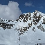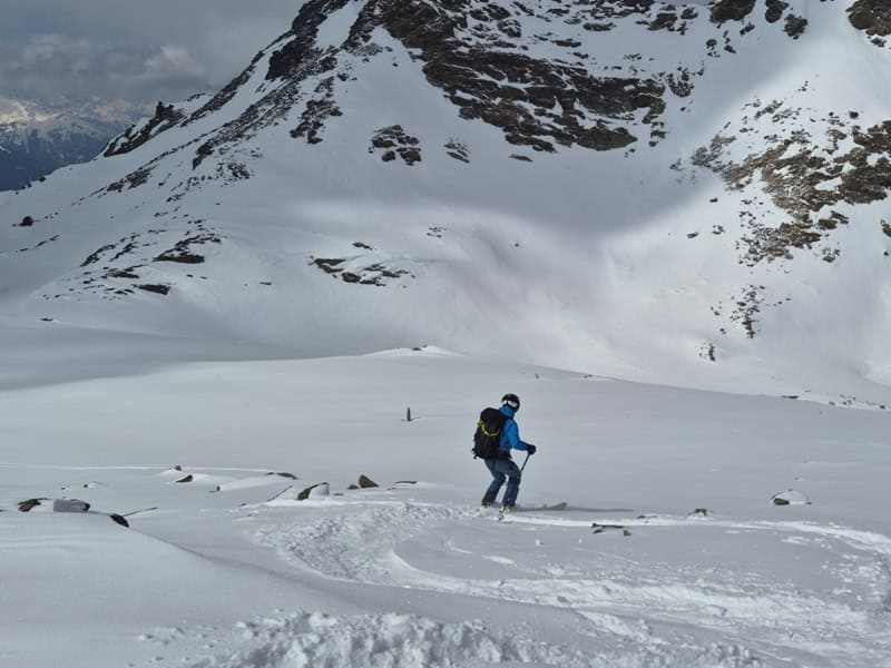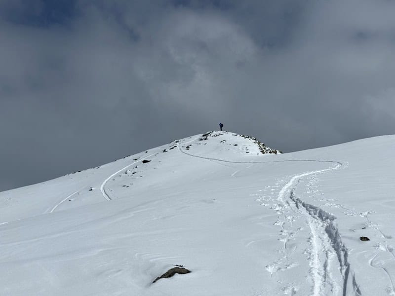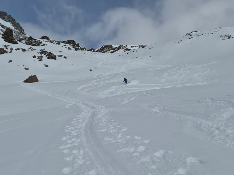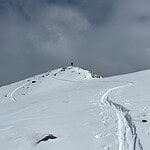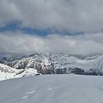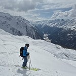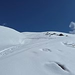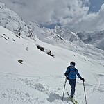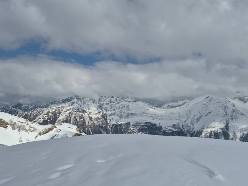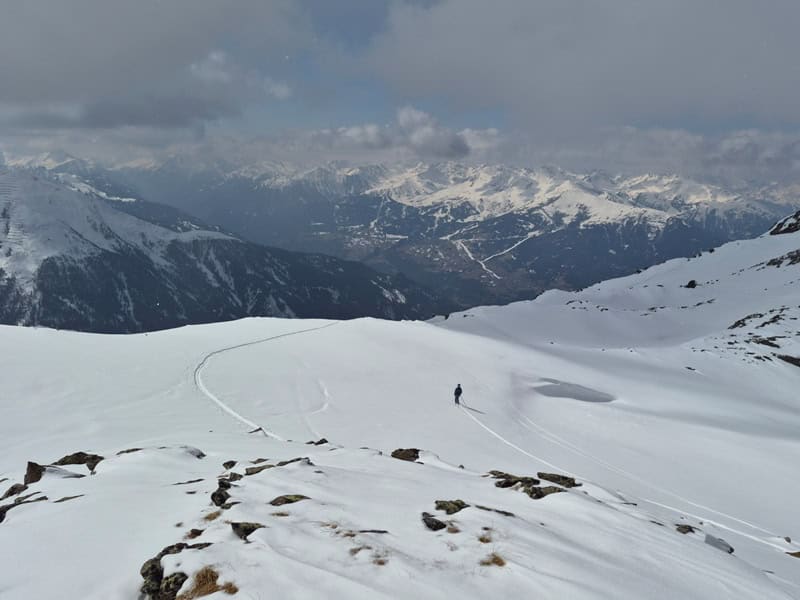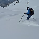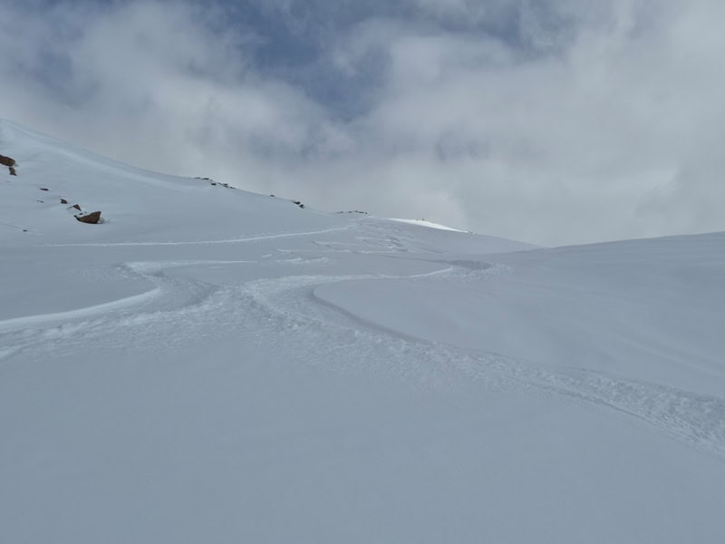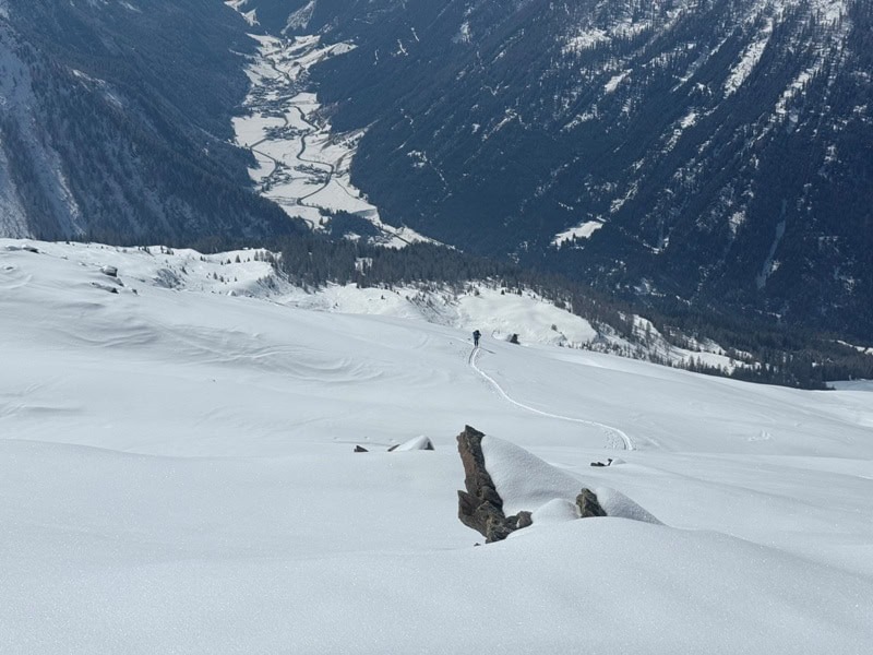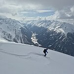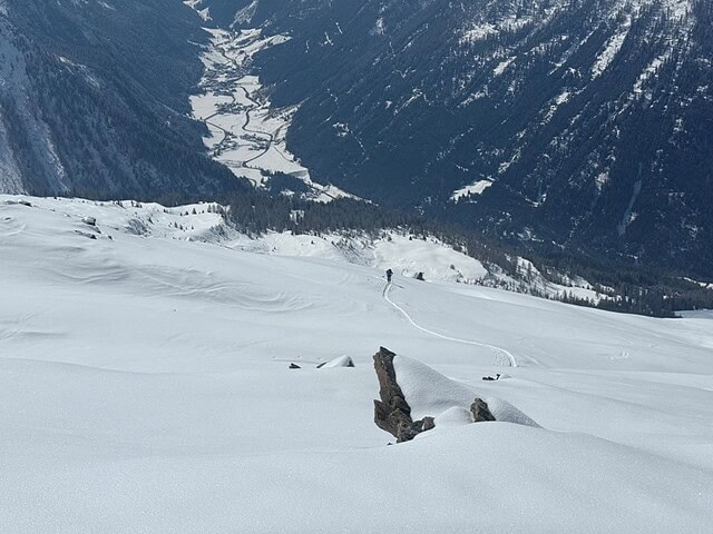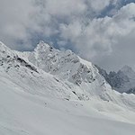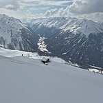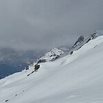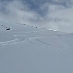 Nachdem die Sonneneinstrahlung bereits geraume Zeit ausblieb, beschlossen wir die Abfahrt anzutreten, denn ein nochmaliges Sonnenfenster war nicht zu erwarten. Die ersten Hänge unter Pulverschnee hatten wir im endenden März auch selten erlebt und so erfreuten wir uns an den leichten Schwüngen.