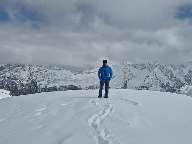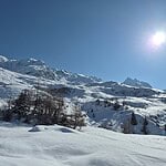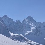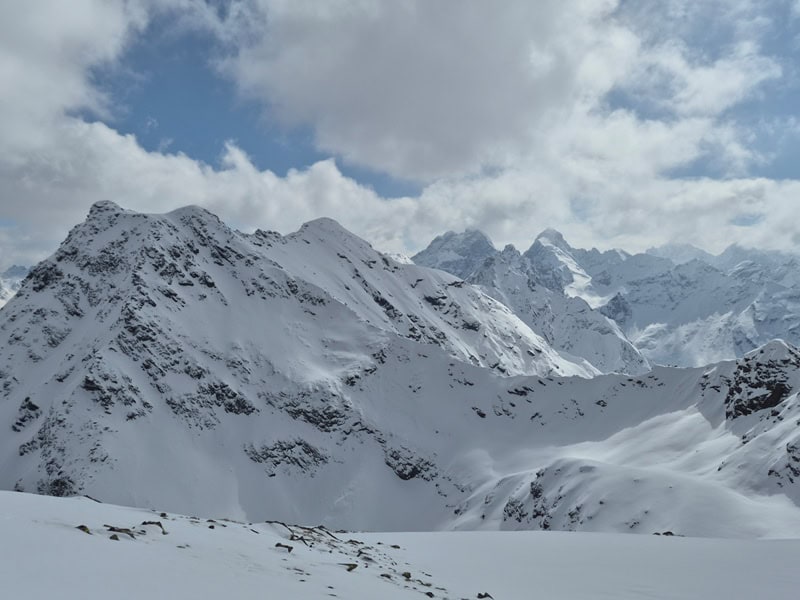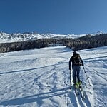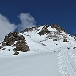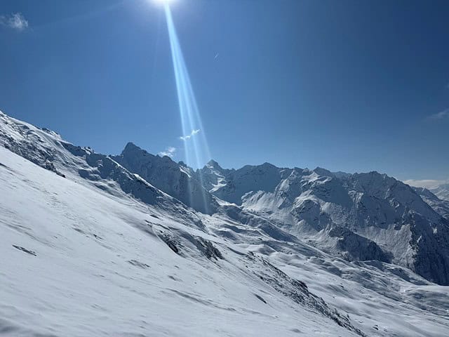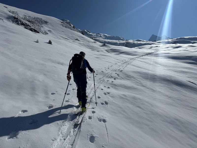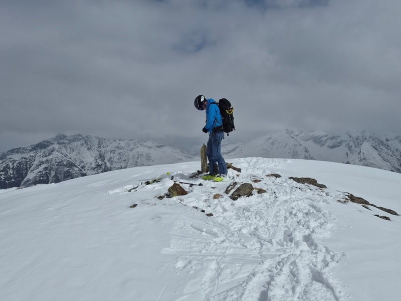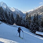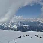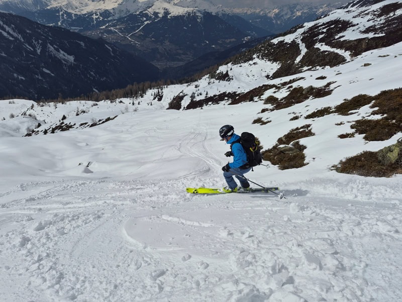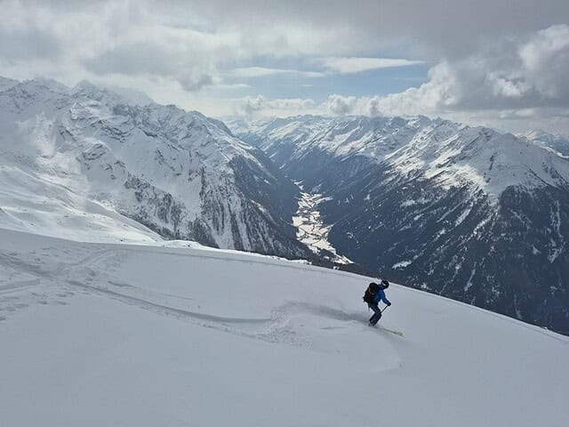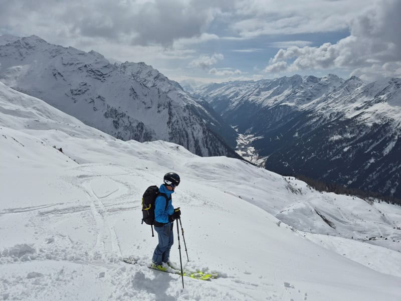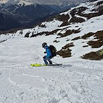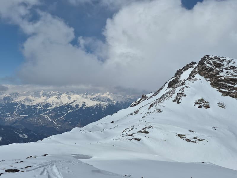Nachdem die Sonneneinstrahlung bereits geraume Zeit ausblieb, beschlossen wir die Abfahrt anzutreten, denn ein nochmaliges Sonnenfenster war nicht zu erwarten. Die ersten Hänge unter Pulverschnee hatten wir im endenden März auch selten erlebt und so erfreuten wir uns an den leichten Schwüngen.