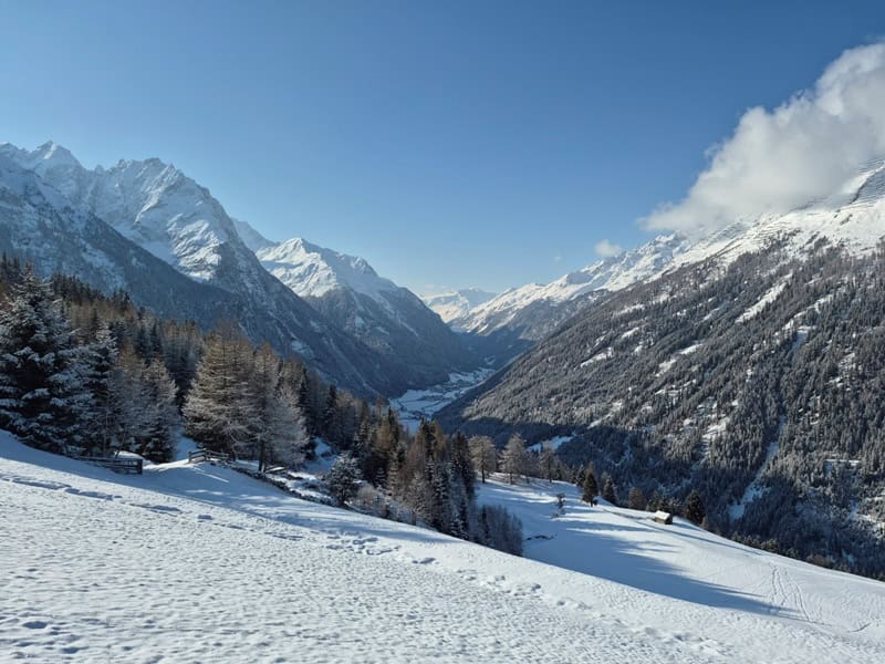Vor dem Eintauchen in den Wald muß unbedingt noch der Blick auf den Talschluß ausgekostet werden, ein Blick, der haften bleibt, mit der mächtigen Weißseespitze (3.498 m) in 25 km Entfernung und dem an ihrem Ostabhang hervorstechenden Weißkugelgipfel (3.738 m) als Krönung dieses epischen Blickes. Auf der linken Talseite in Blickrichtung erschaudert man vor dem aufgerissenen, wilden und jäh ins Tal abfallenden Grat des Schweikert (2.881 m).