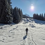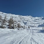 Am Almweg führt die Route nun über zwei Kehren moderat steigend bis zu einer größeren lichten Fläche mit einer Wegkreuzung, an der sich die Route südöstlich dreht und kurzzeitig den Weg verläßt. Über die ausgeschlägerte Waldfläche angestiegen, erreichten wir den Almweg wieder. Bald darauf tauchte eine Dreiergruppe auf einer Freifläche unterhalb des Wegs auf, die von der letzten Serpentine im Wald den Sommerweg zur Abkürzung benützt haben dürfte. Im unteren Teil der Schitour gibt es je nach Tourenführer die beiden Varianten ab dem Parkplatz über den Weg oder die Wiesen, im oberen Teil vor der Alm den Sommerweg durch den Wald unter Abkürzung der geschlägerten Freifläche.