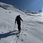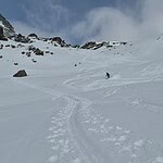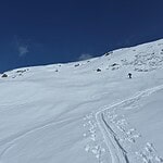 Das schöne, weitläufige Gelände läßt für die Abfahrt im wahrsten Sinn breiten Spielraum zu. Für den Aufstieg empfahl sich alle Gruppen an diesem Tag aufgrund des ausgeaperten Mittelteils eine Route rechter Hand hin zum Roßboden, wo auch auf den Hinteren Stupfarri aufgestiegen werden kann.