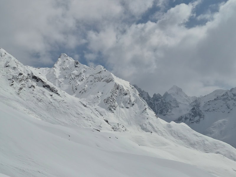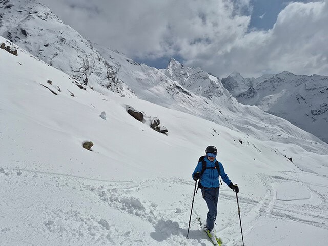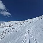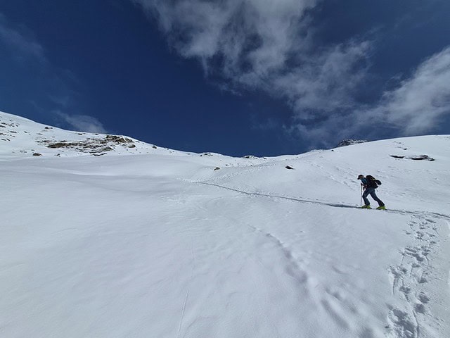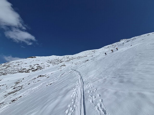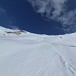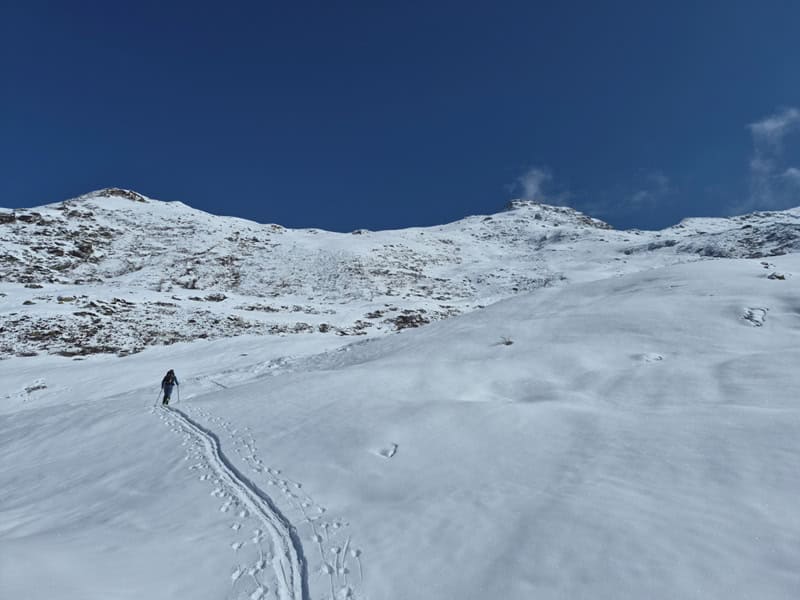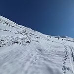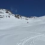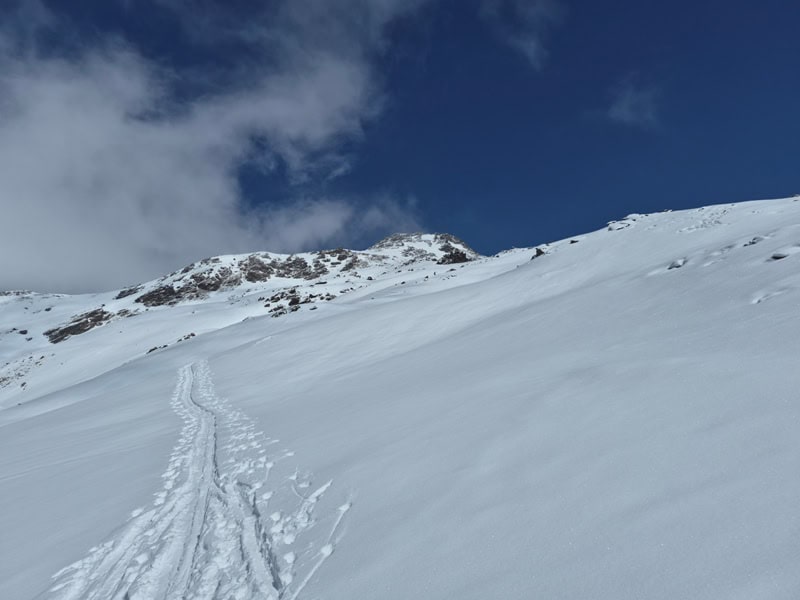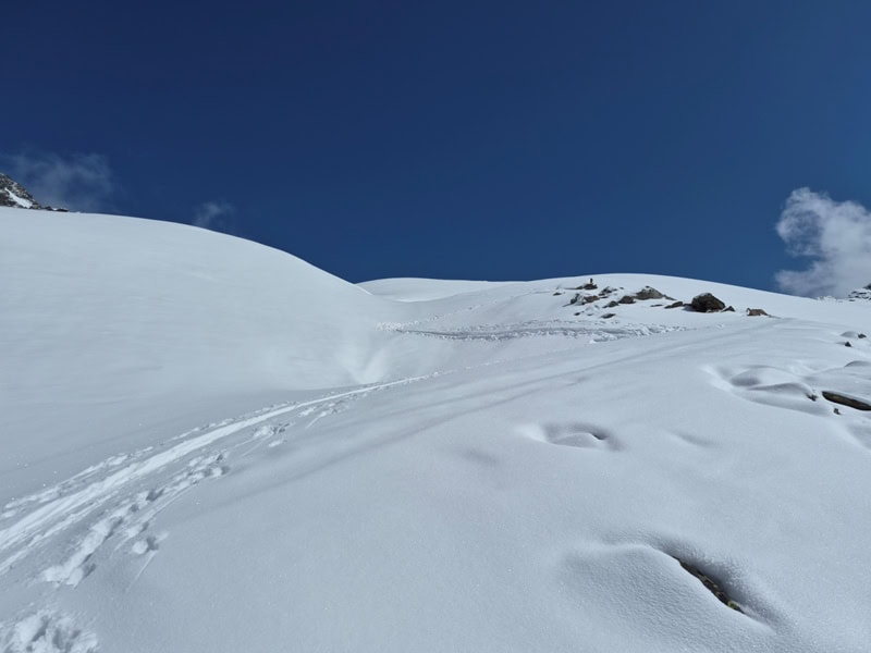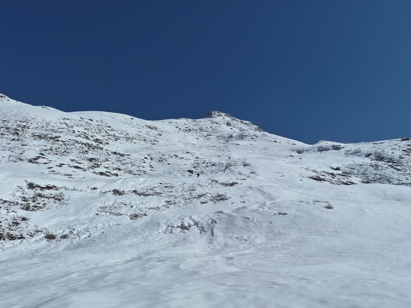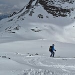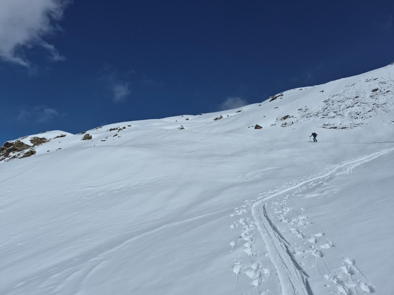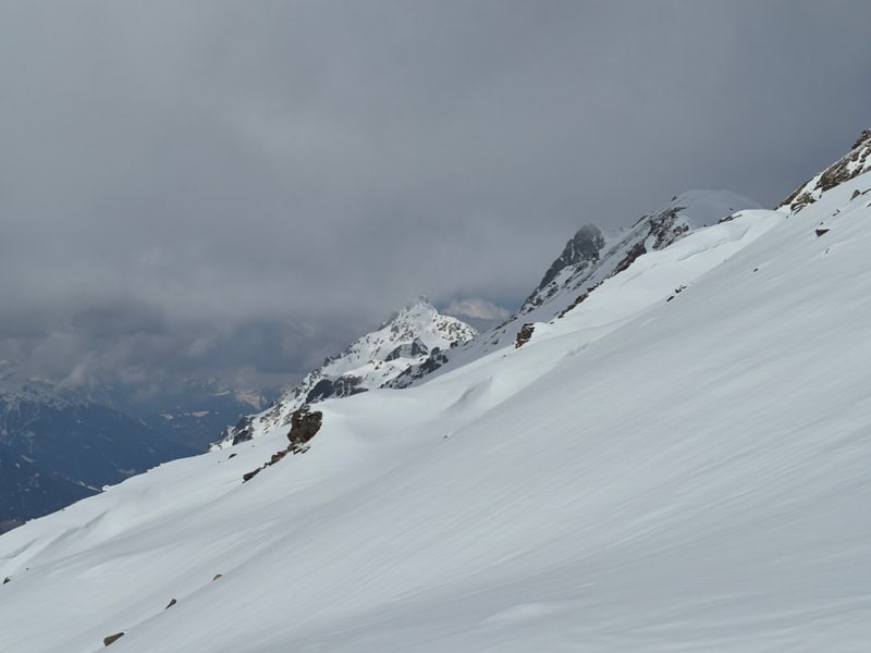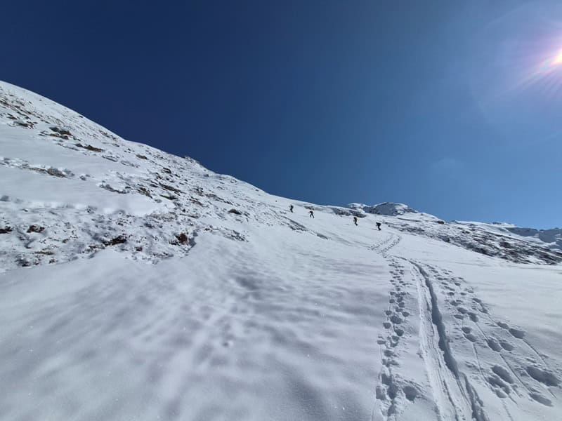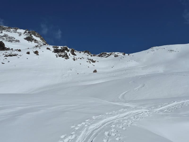 Weiter oben, etwas unterhalb der Kote 2.400 m, drehten die geländekundigen Gruppen nach links bis leicht über die Nordrichtung hinaus, um den steileren Hangteil zu queren. Im Bereich von 2.500 m erreicht die Route für etwa 50 Hm ihre größte Hangneigung in typischem Lawinengelände. Bei unserer Begehung war jedoch trotz des Neuschnees keine Gefahr daraus mehr vorhanden. Die Neuschneeauflage erreichte keine Mächtigkeit, die gefahrbringend gewesen wäre, der Untergrund fester Firn.