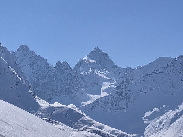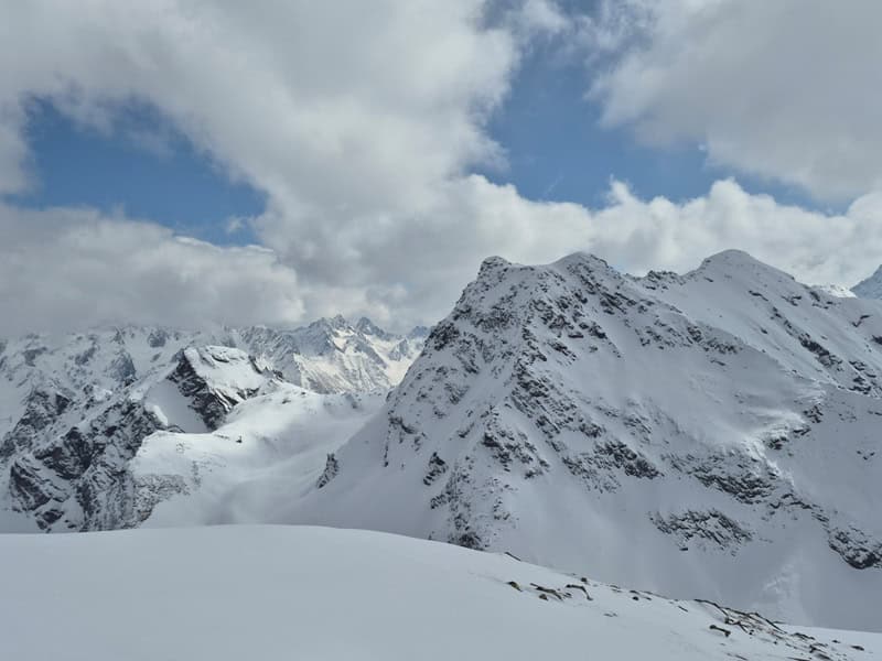 Im Uhrzeigersinn nach der Rofelewand setzt der beim Aufstieg so erhaben thronende Peischlkopf in nächster Nähe an, dann der etwas höhere Große Dristkogel, bevor der schöne Haifischzahn des Gsallkopfs ins Auge sticht. Über die schön beleuchtete Nordwestflanke vollzieht sich die schwere Schitour auf diese mächtige Spitze.
